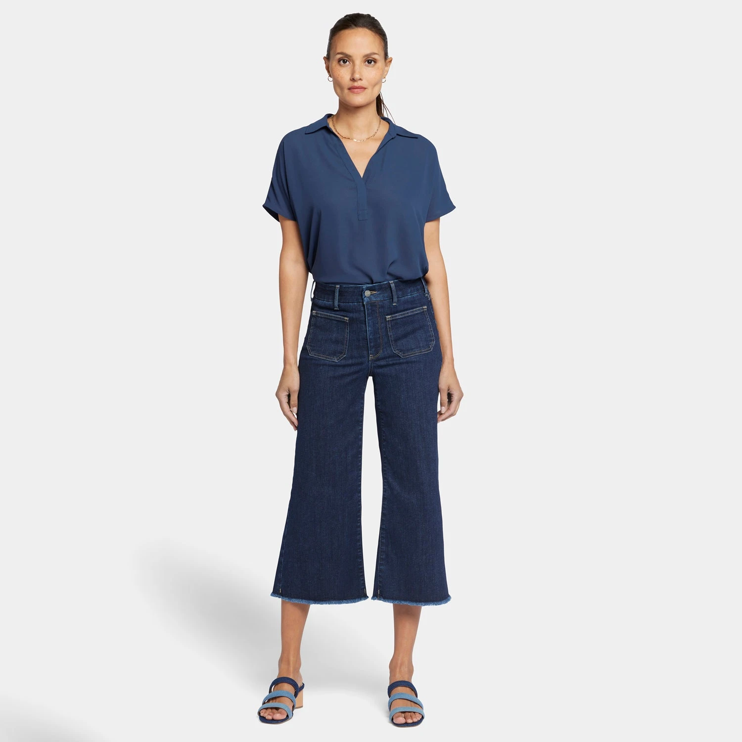 A major wide leg and front patch pockets give NYDJ’s Patchie Wide Leg Capri Jeans with Frayed Hems a bold, fashion-forward look. This capri-length jean is also detailed with cutoff hems, keeping the styling laid back. Our Lift Tuck® Technology uses a proprietary slimming panel with a patented criss-cross design to shape and support your curves while providing a smoother fit in front. Finished with a zip fly, button waist, back pockets and pressed creases in front and back. Sublime is a dark indigo wash with subtle whiskering and gentle hand sanding on the thighs and seat.