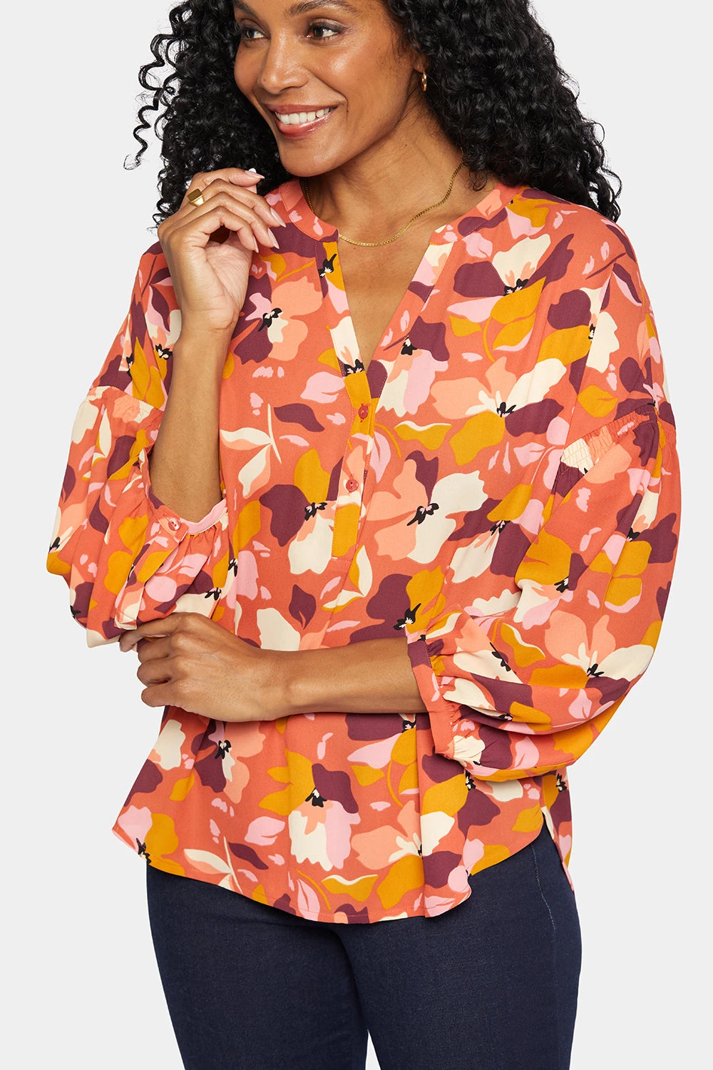 Pretty meets polished in the Paulina Peasant Blouse by NYDJ. The easy silhouette pairs perfectly with your favorite denim, while dropped, gathered sleeves offer effortless feminine style. It’s accented with soft gathers at the back and finished with button front closures.