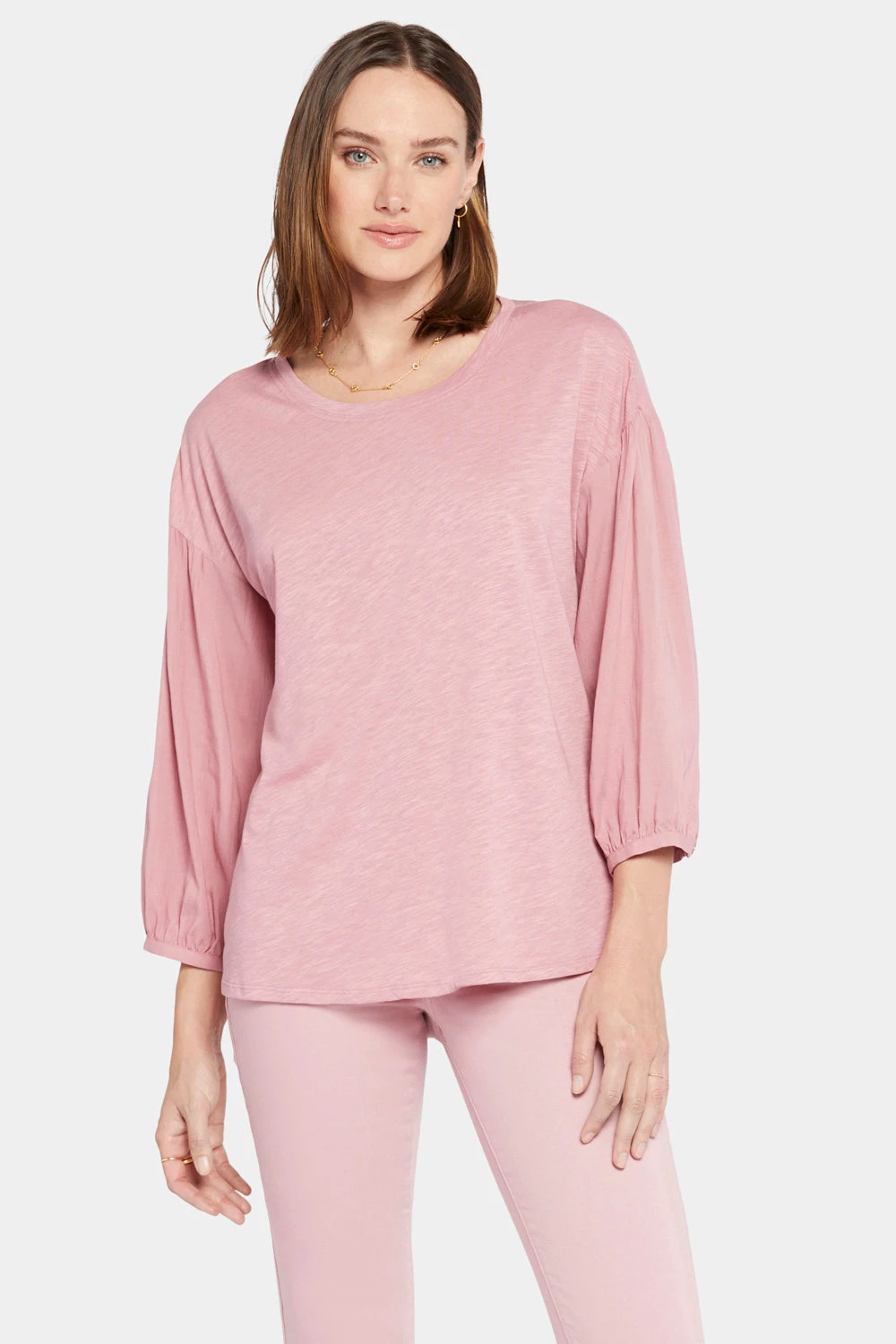 NYDJ’s Peasant Tee is an elegant yet easy top to add to your wardrobe. The relaxed silhouette pairs well with jeans, capris and shorts while feeling deliciously breezy. Dropped three-quarter sleeves made from a viscose-linen blend contrast with the soft jersey body and feature pretty gathers and button cuffs that give the styling a romantic look.