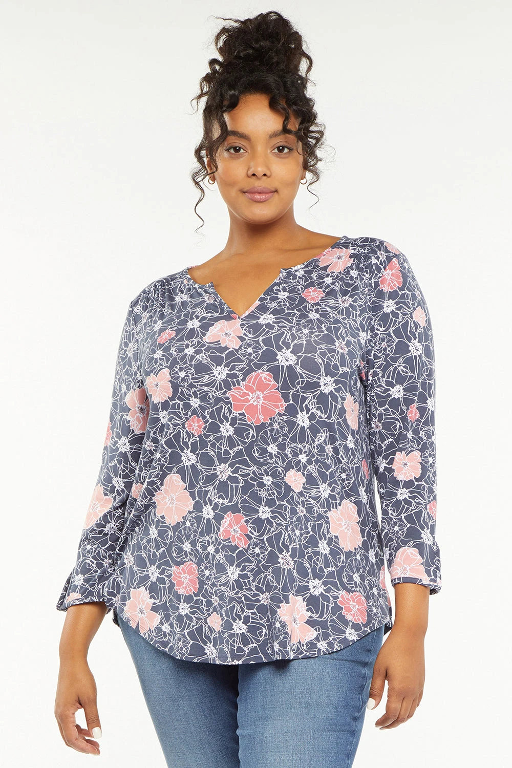 Here at NYDJ we call it the Perfect Tee in Plus Size because it is! Boho-inspired with a tunic neckline, this wear-with-anything tee is softened with pintucks at the shoulder, a shaped hemline and a relaxed fit. Features three-quarter-length sleeves.