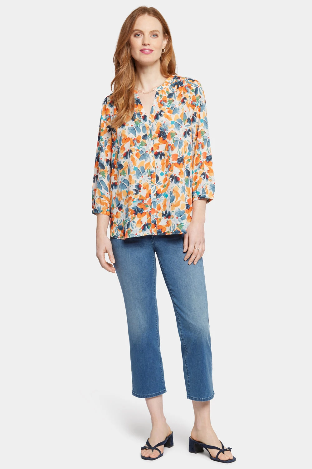 NYDJ’s Pintuck Blouse boasts a billowy three-quarter-sleeved silhouette that’s perfect when paired with any of our slimming denim styles. Pleating at the back yoke creates a sophisticated yet easy drape. Split round neckline with covered full front placket and button closures. This blouse is made with a sustainable polyester fiber created from 100% post-consumer plastic waste, resulting in less water and energy use and fewer greenhouse gas emissions without changing the look and feel of the fabric.