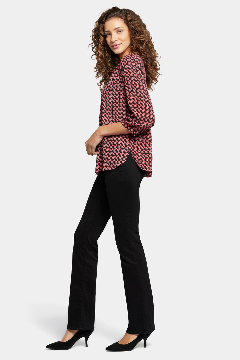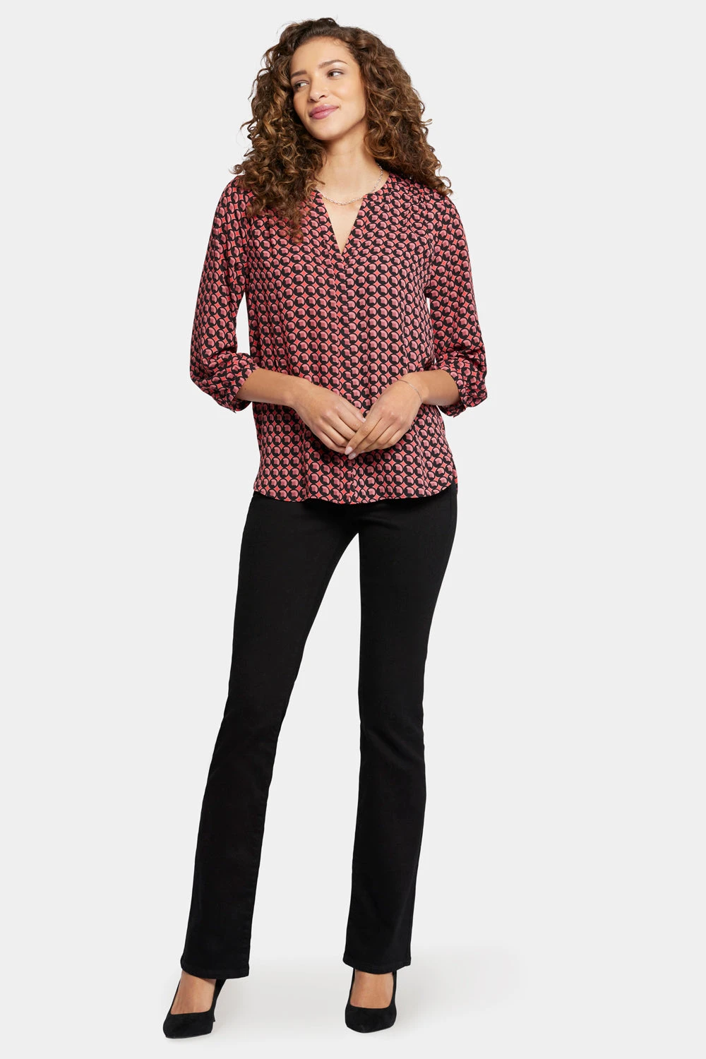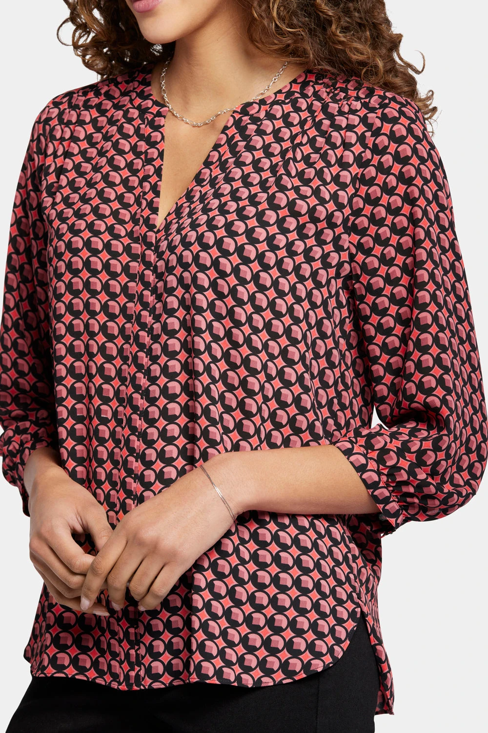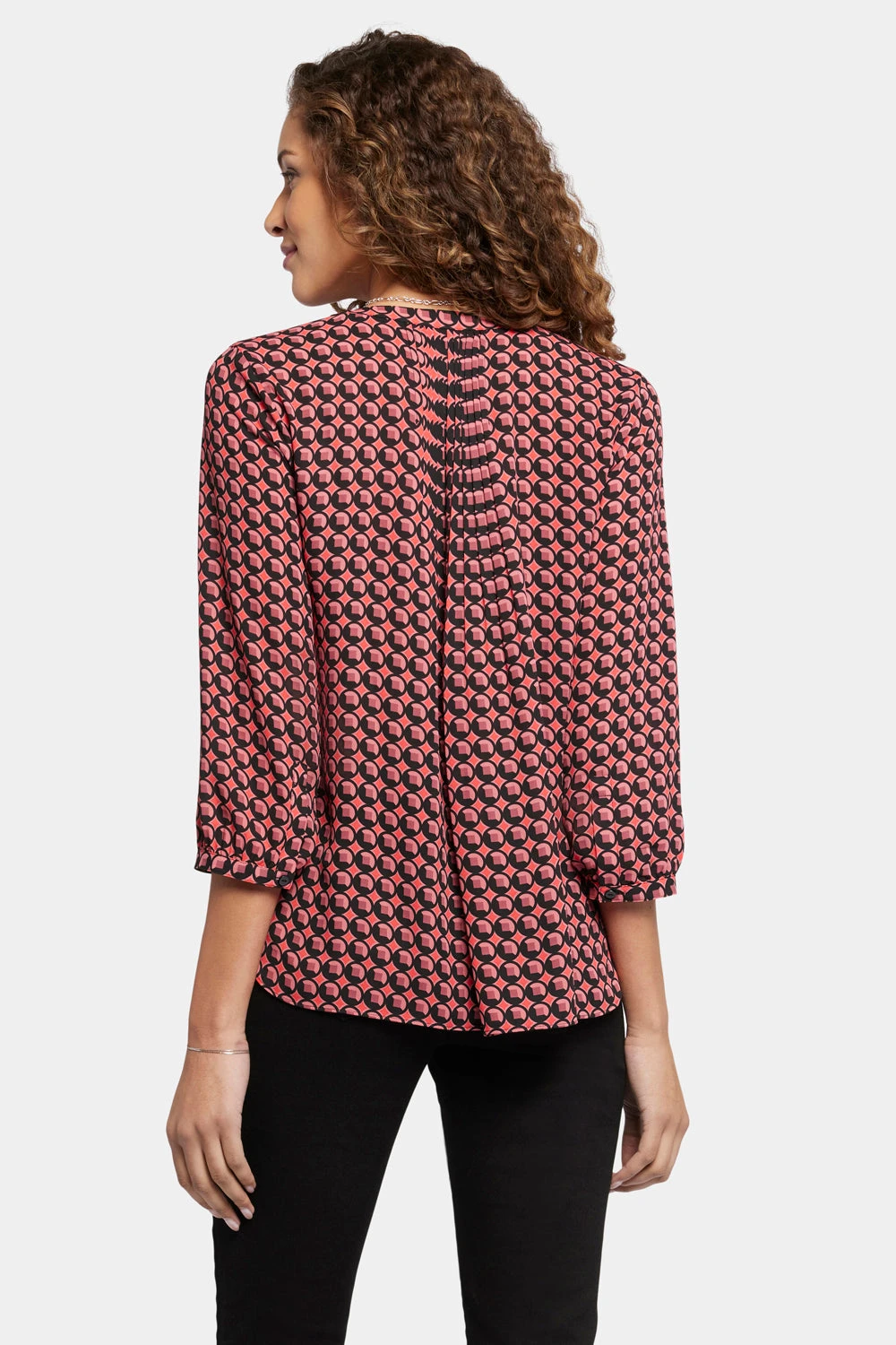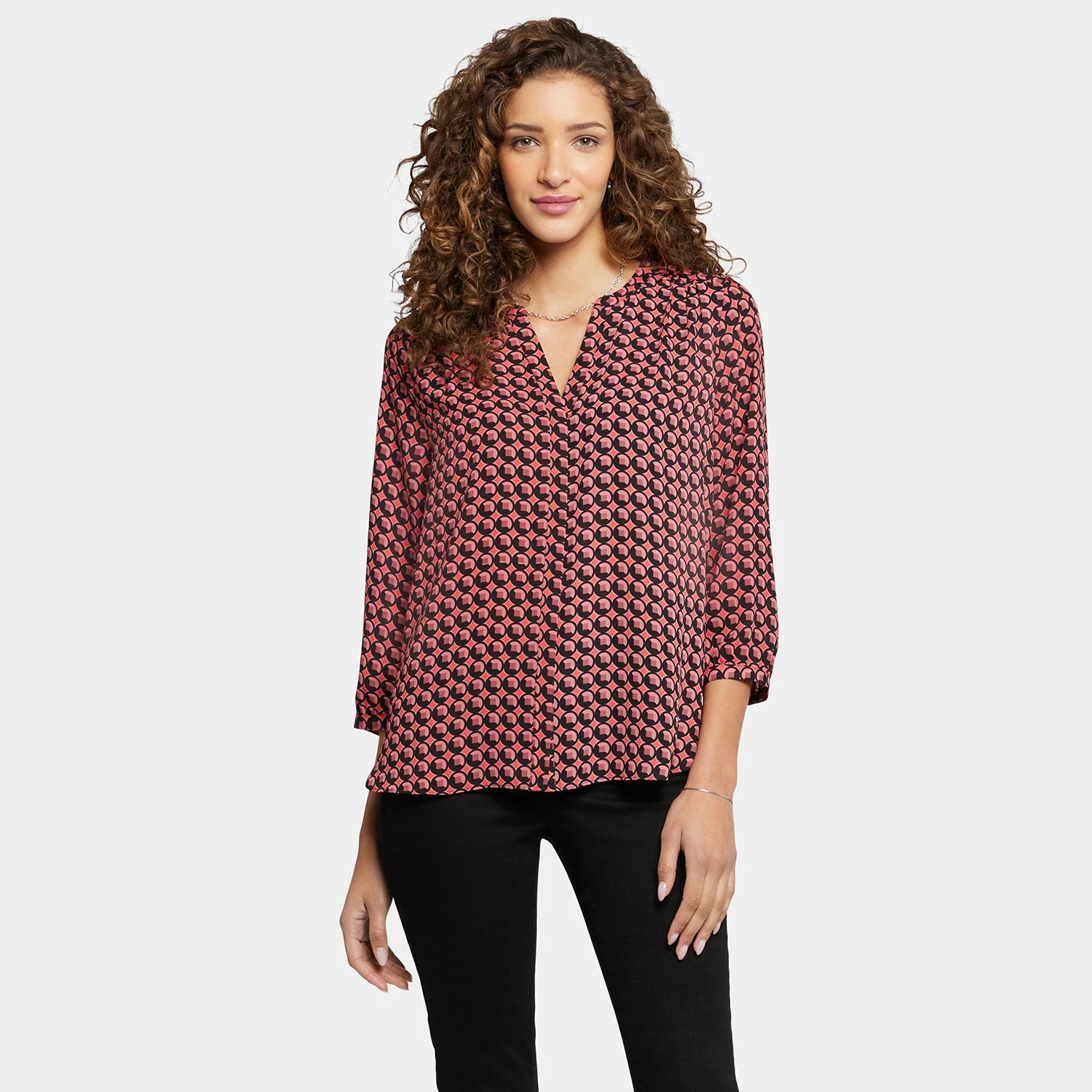 NYDJ’s Pintuck Blouse boasts a billowy three-quarter-sleeved silhouette that’s perfect when paired with any of our slimming denim styles. Pleating at the back yoke creates a sophisticated yet easy drape. Split round neckline with covered full front placket and button closures. This blouse is made with a sustainable polyester alternative fiber created from 100% post-consumer waste from recycled plastic bottles, resulting in less water and energy use and fewer greenhouse gas emissions without changing the look and feel of the fabric. The buttons are made with 50% post-consumer recycled polyester.