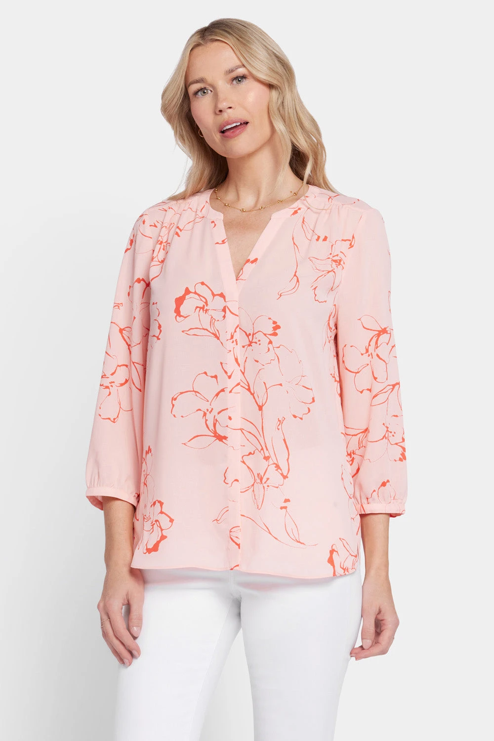 NYDJ’s Pintuck Blouse boasts a billowy three-quarter-sleeved silhouette that’s perfect when paired with any of our slimming denim styles. Pleating at the back yoke creates a sophisticated yet easy drape. Split round neckline with covered full front placket and button closures. This blouse is made with a sustainable polyester alternative fiber created from 100% post-consumer waste from recycled plastic bottles, resulting in less water and energy use and fewer greenhouse gas emissions without changing the look and feel of the fabric. The buttons are made with 50% post-consumer recycled polyester.
