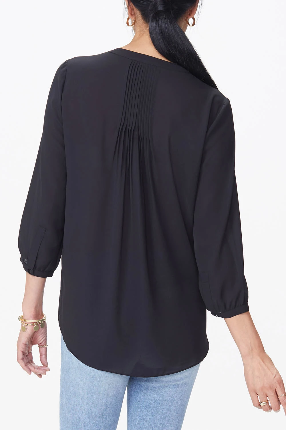 NYDJ’s Pintuck Blouse in Petite boasts a billowy three-quarter-sleeved silhouette that’s perfect when paired with any of our slimming denim styles. Pleating at the back yoke creates a sophisticated yet easy drape. Split round neckline with covered full front placket and button closures. This blouse’s fabric is made with a sustainable polyester fiber created from 100% post-consumer plastic waste, resulting in less water and energy use and fewer greenhouse gas emissions without changing the look and feel of the fabric. The buttons are made with 50% post-consumer recycled polyester.