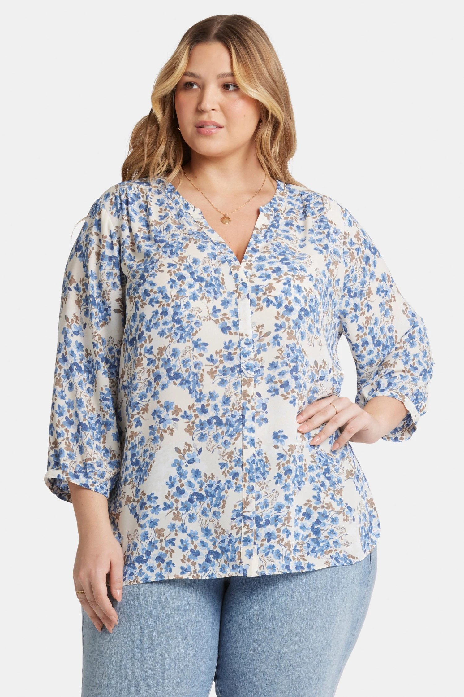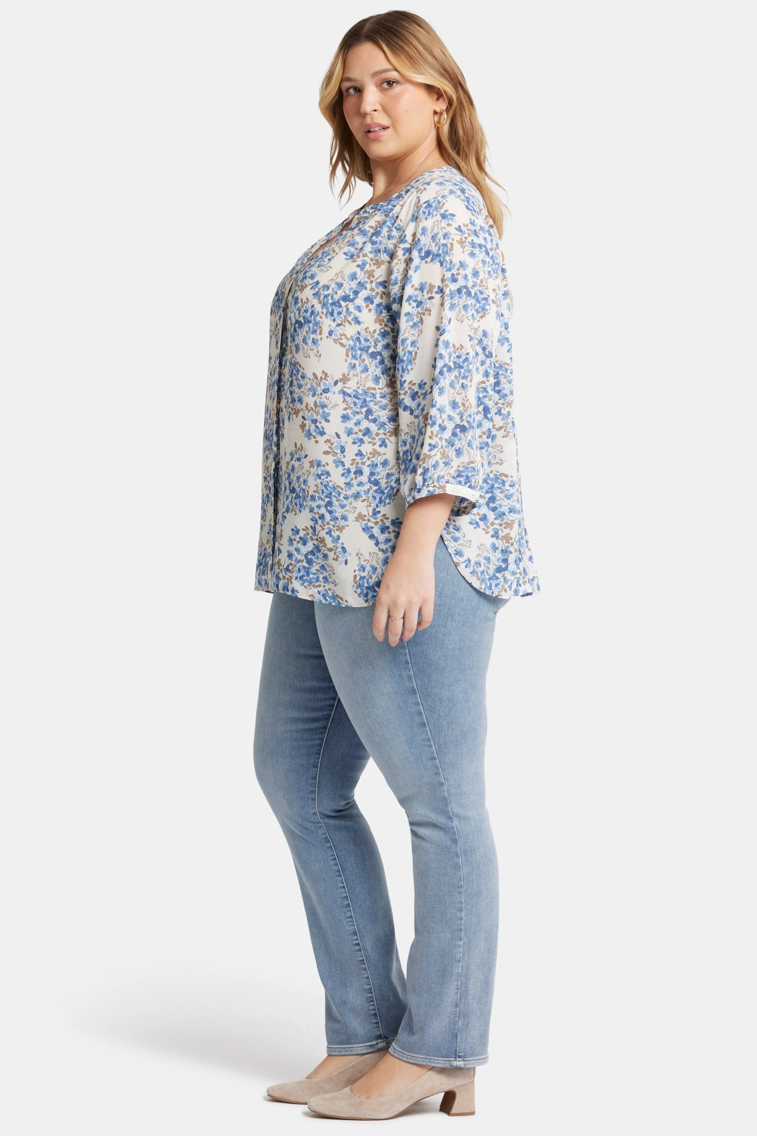 NYDJ’s Pintuck Blouse in Plus Size boasts a billowy three-quarter-sleeved silhouette that’s perfect when paired with any of our slimming denim styles. Pleating at the back yoke creates a sophisticated yet easy drape. Split round neckline with covered full front placket and button closures. This blouse is made with a sustainable polyester alternative fiber created from 100% post-consumer waste from recycled plastic bottles, resulting in less water and energy use and fewer greenhouse gas emissions without changing the look and feel of the fabric. The buttons are made with 50% post-consumer recycled polyester.