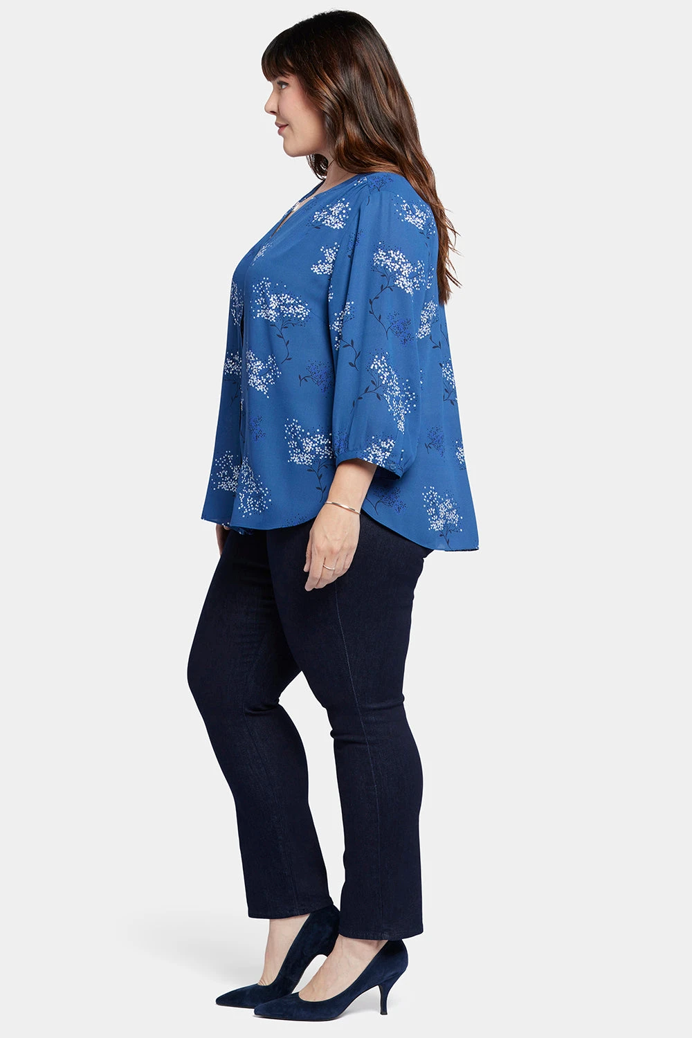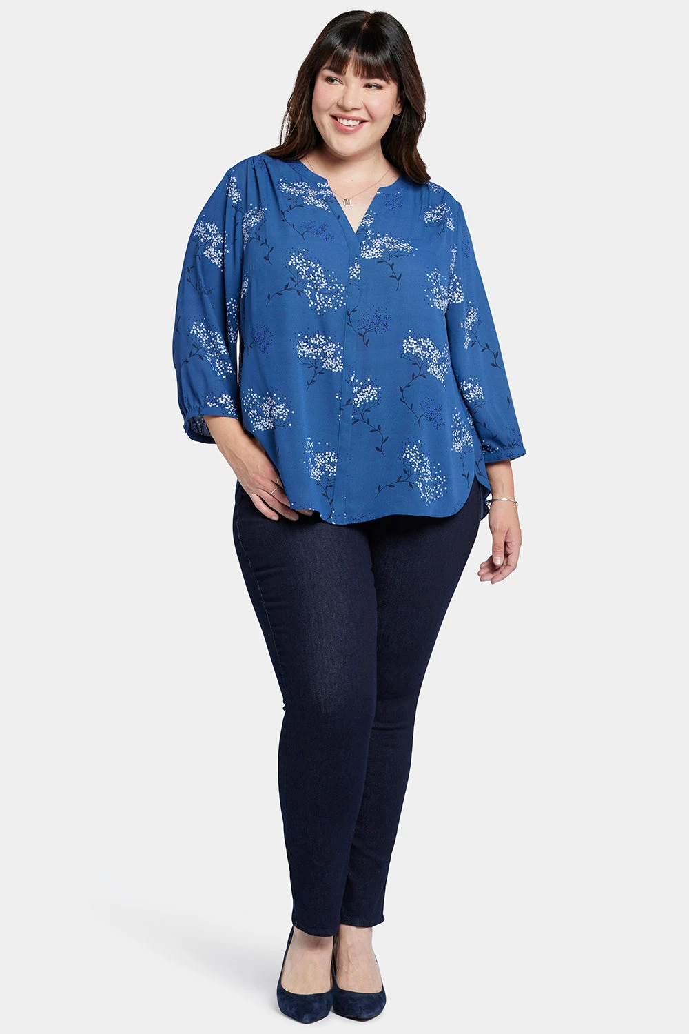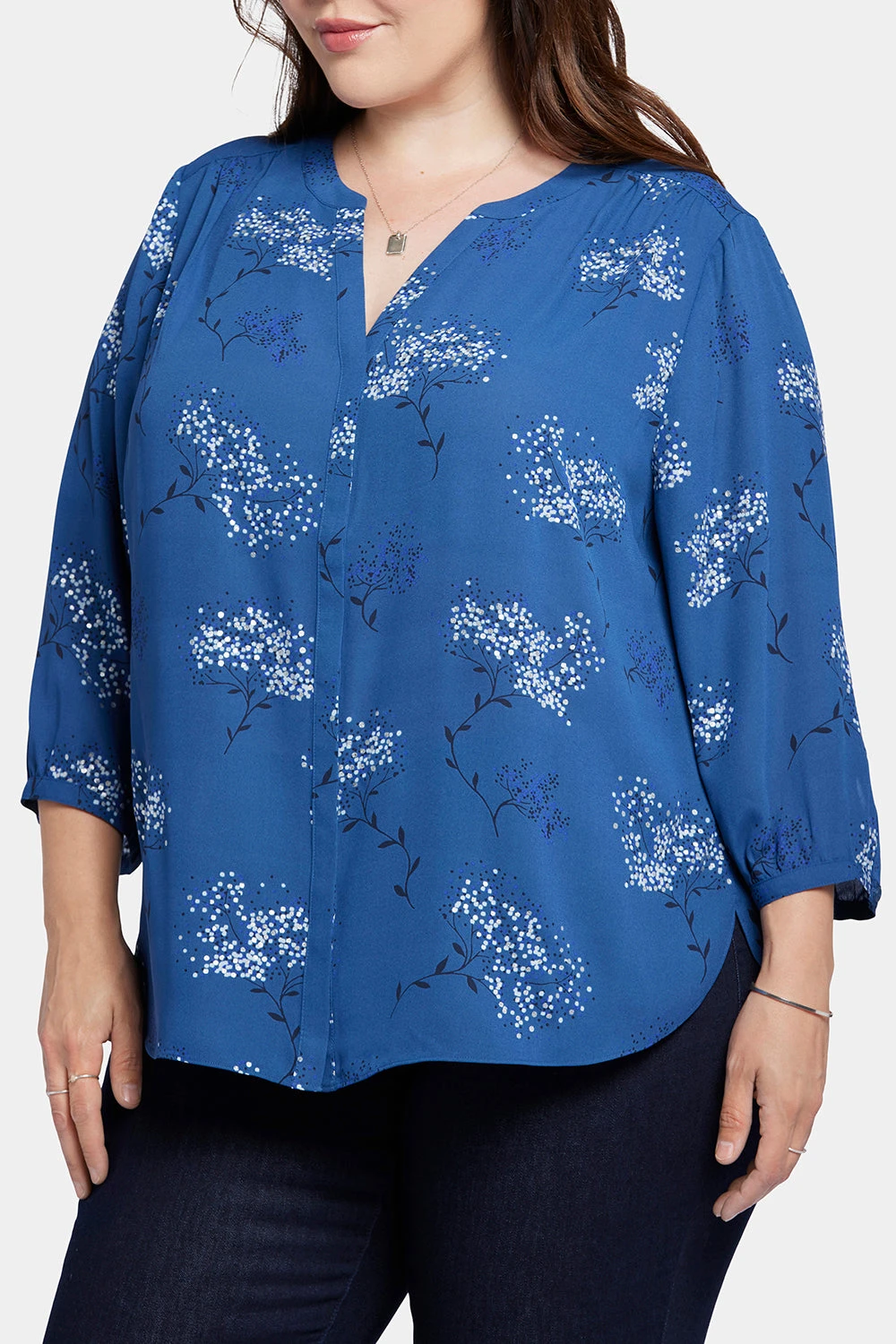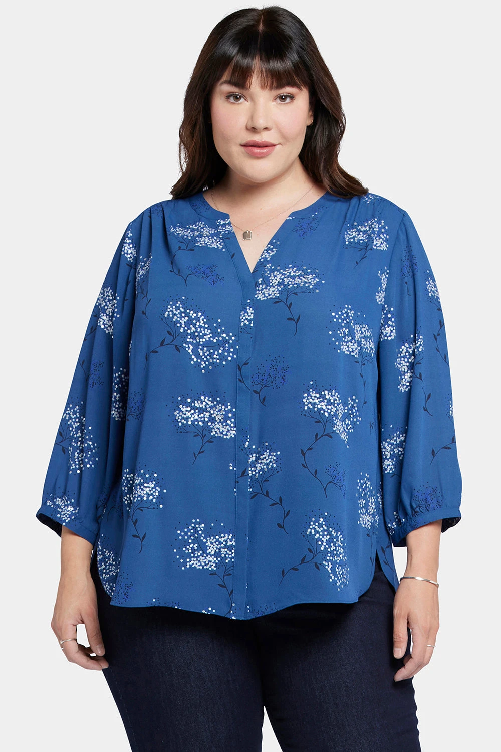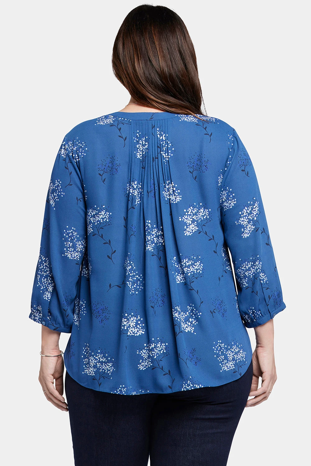 NYDJ’s Pintuck Blouse in Plus Size boasts a billowy three-quarter-sleeved silhouette that’s perfect when paired with any of our slimming denim styles. Pleating at the back yoke creates a sophisticated yet easy drape. Split round neckline with covered full front placket and button closures. This blouse’s fabric is made with a sustainable polyester fiber created from 100% post-consumer plastic waste, resulting in less water and energy use and fewer greenhouse gas emissions without changing the look and feel of the fabric. The buttons are made with 50% post-consumer recycled polyester.
