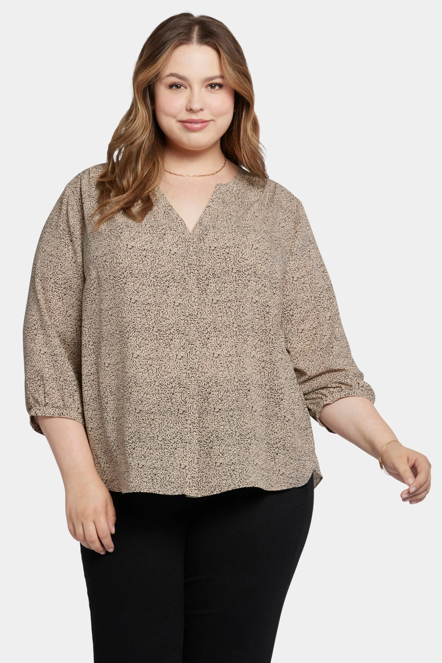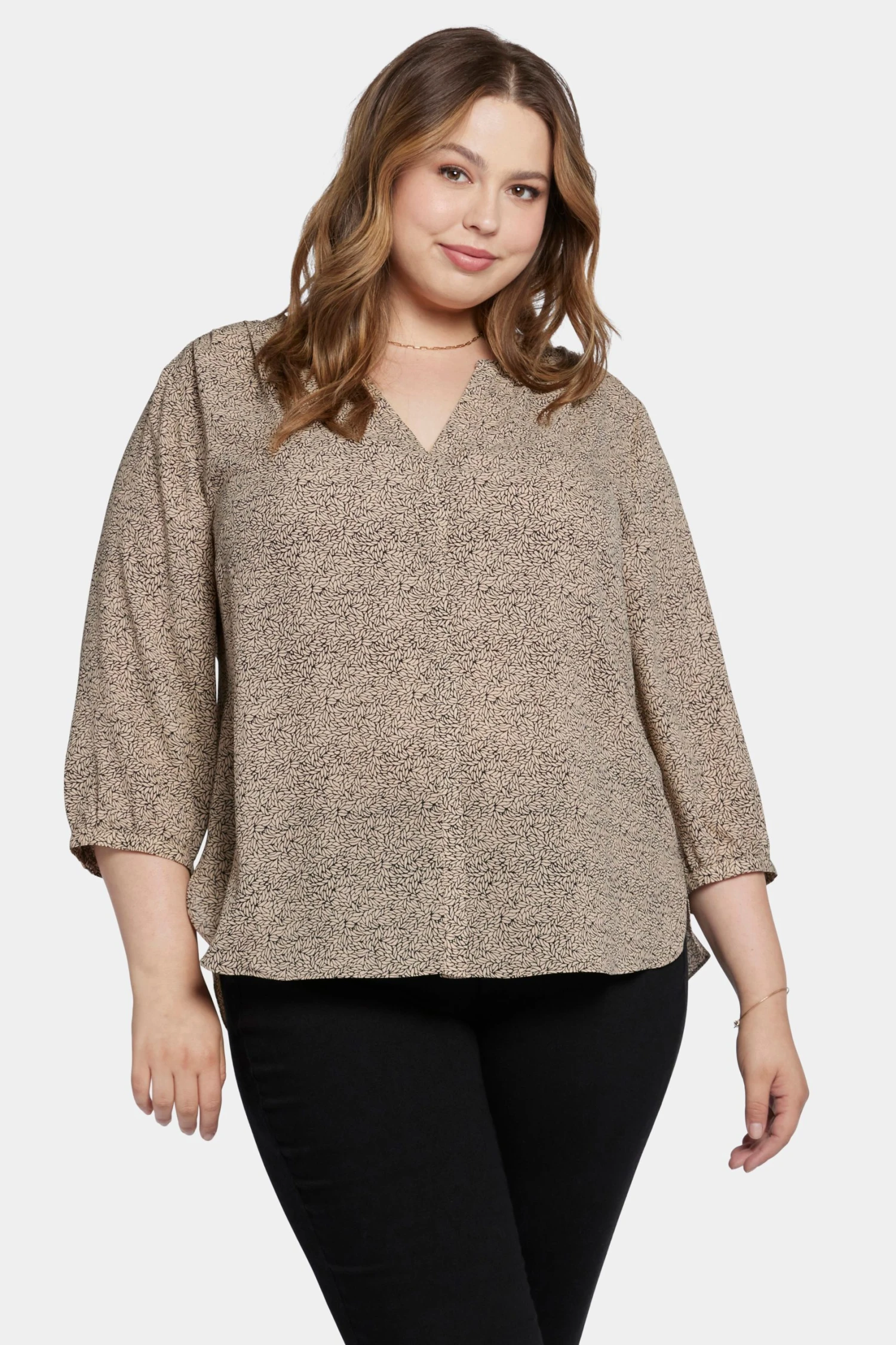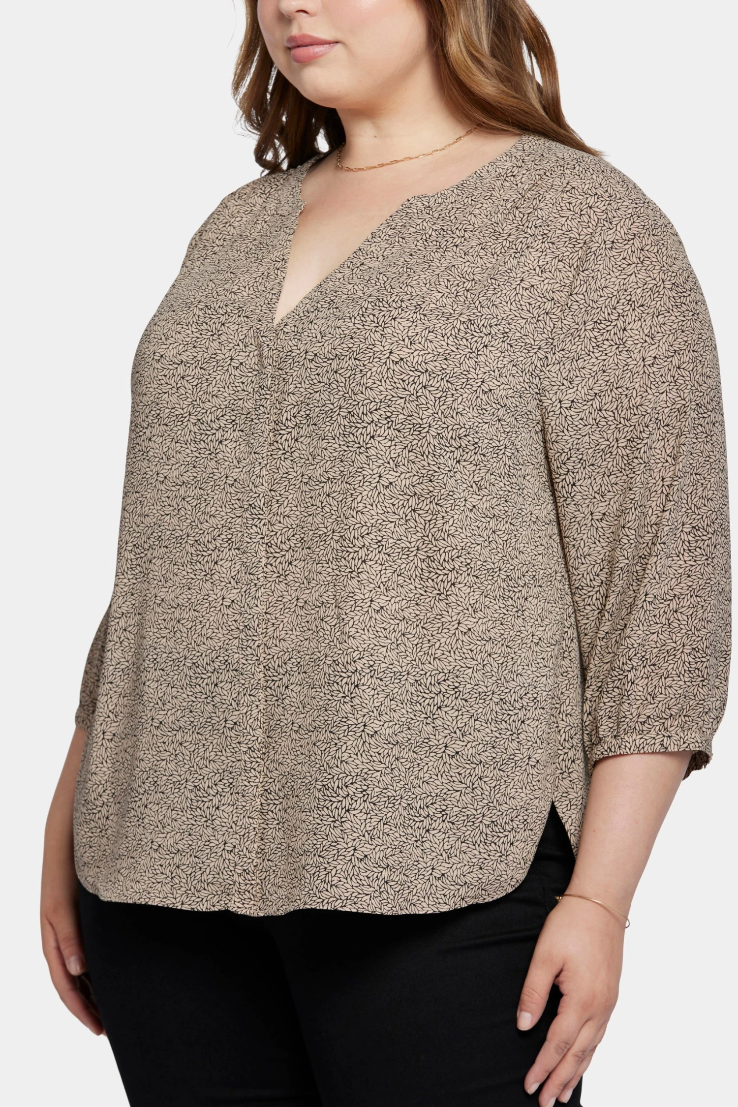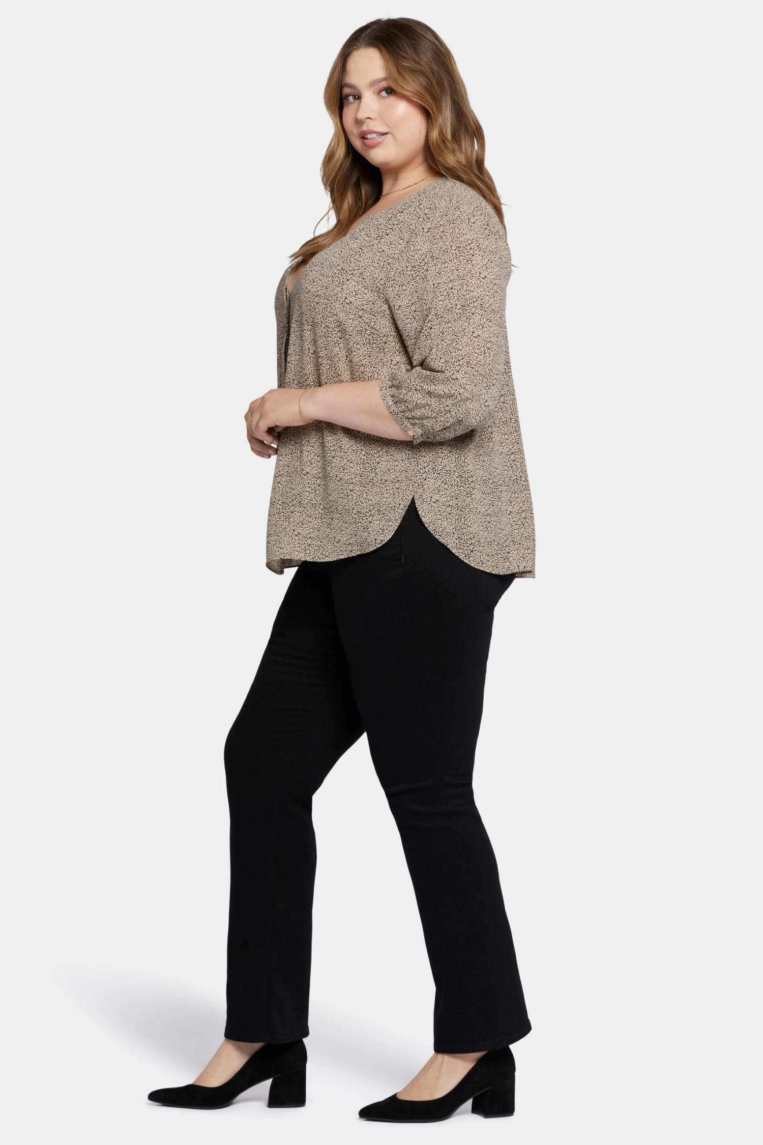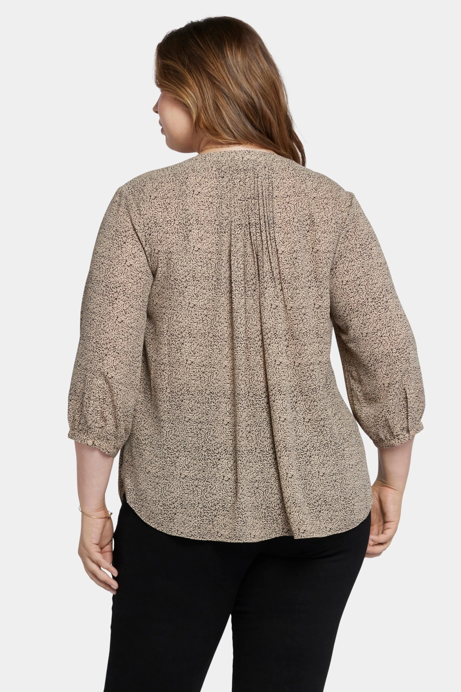 NYDJ’s Pintuck Blouse in Plus Size boasts a billowy three-quarter-sleeved silhouette that’s perfect when paired with any of our slimming denim styles. Pleating at the back yoke creates a sophisticated yet easy drape. Split round neckline with covered full front placket and button closures. This blouse’s fabric is made with a sustainable polyester fiber created from 100% post-consumer plastic waste, resulting in less water and energy use and fewer greenhouse gas emissions without changing the look and feel of the fabric. The buttons are made with 50% post-consumer recycled polyester.