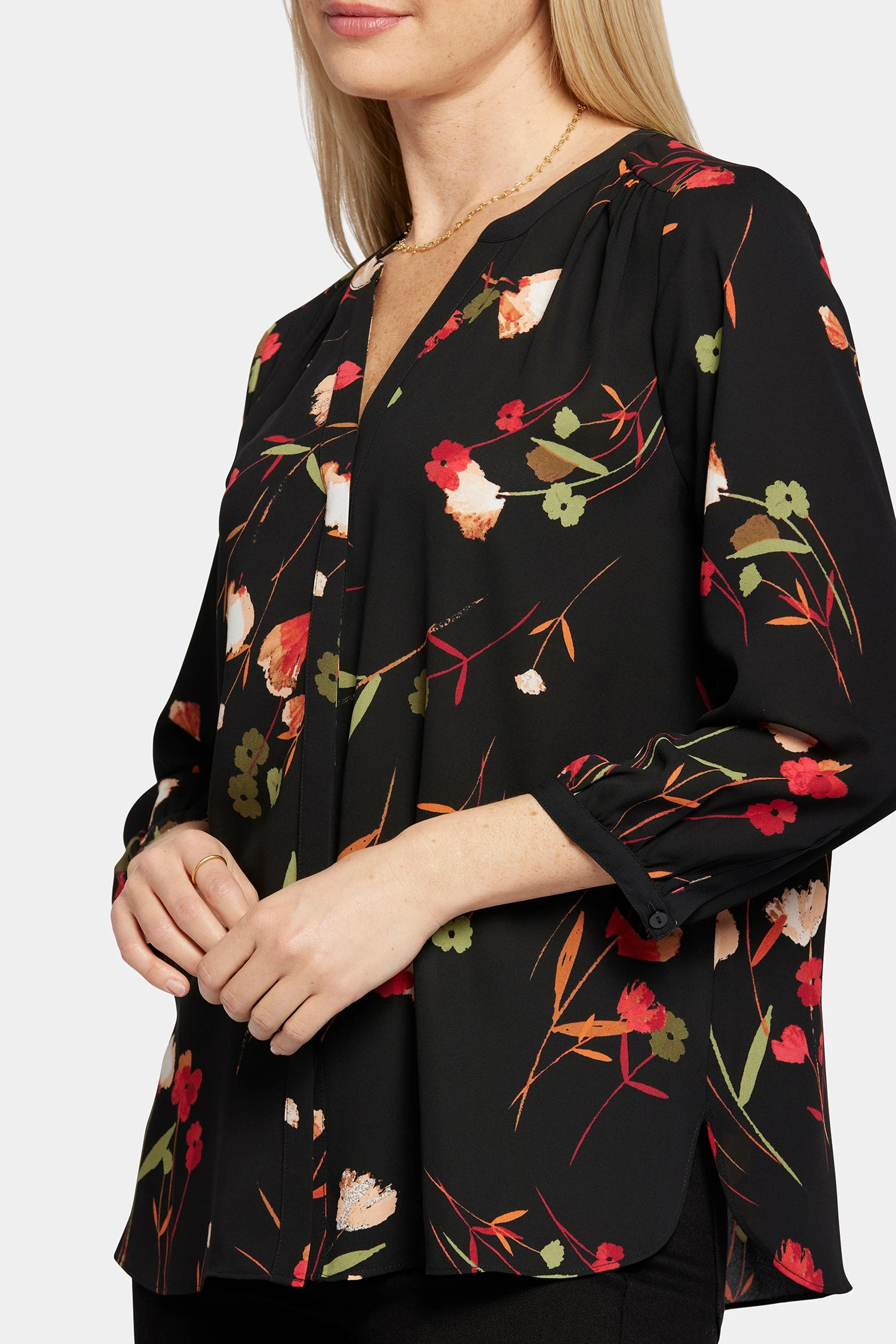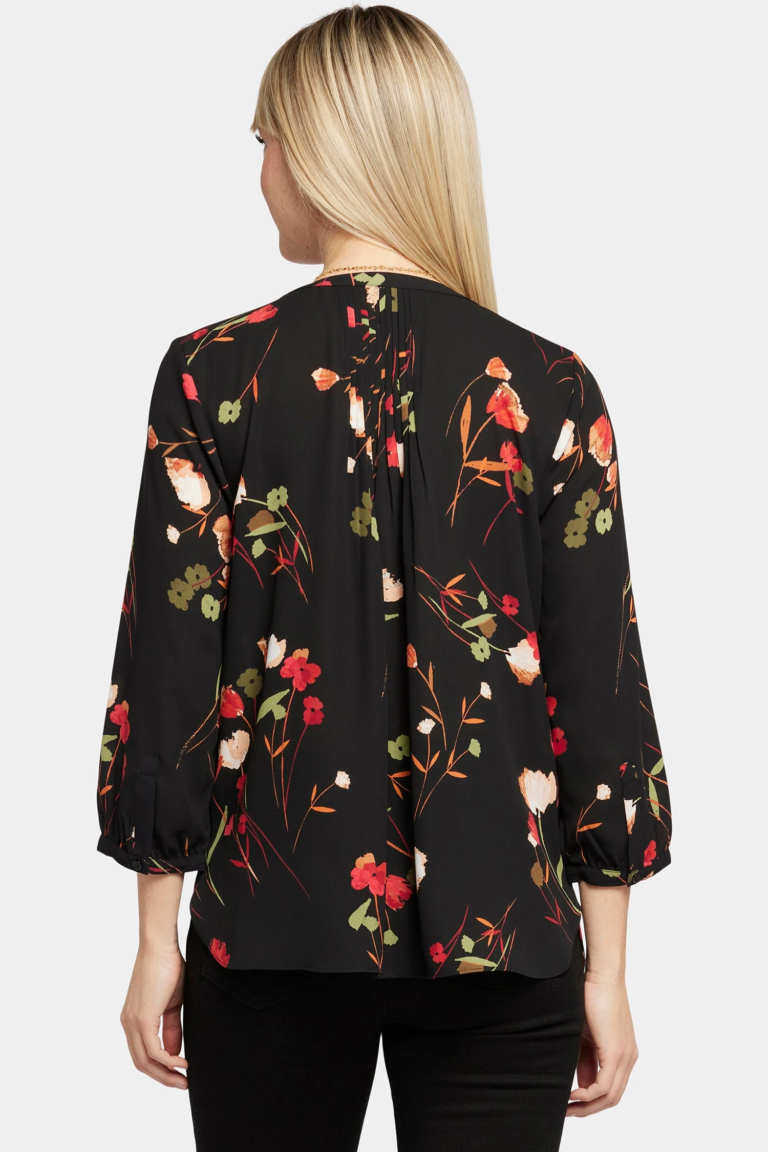 NYDJ’s Pintuck Blouse boasts a billowy three-quarter-sleeved silhouette that’s perfect when paired with any of our slimming denim styles. Pleating at the back yoke creates a sophisticated yet easy drape. Split round neckline with covered full front placket and button closures. This blouse is made with a sustainable polyester alternative fiber created from 100% post-consumer waste from recycled plastic bottles, resulting in less water and energy use and fewer greenhouse gas emissions without changing the look and feel of the fabric. The buttons are made with 50% post-consumer recycled polyester.