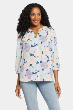 NYDJ’s Pintuck Blouse boasts a billowy three-quarter-sleeved silhouette that’s perfect when paired with any of our slimming denim styles. Pleating at the back yoke creates a sophisticated yet easy drape. Split round neckline with covered full front placket and button closures. This blouse’s fabric is made with a sustainable polyester fiber created from 100% post-consumer plastic waste, resulting in less water and energy use and fewer greenhouse gas emissions without changing the look and feel of the fabric. The buttons are made with 50% post-consumer recycled polyester.
