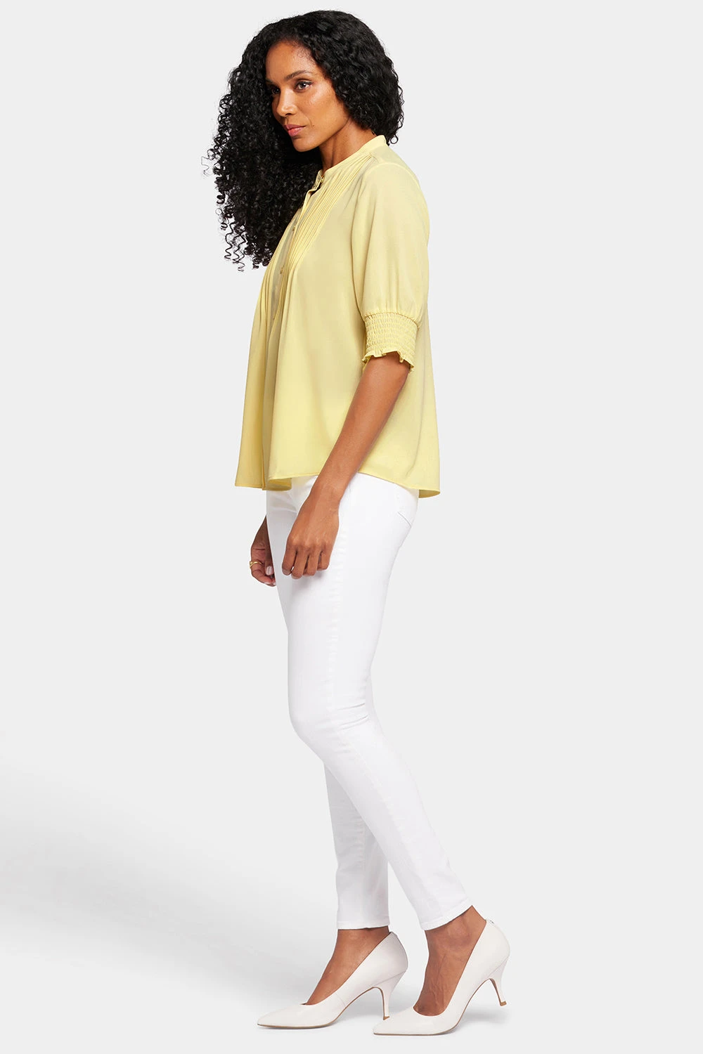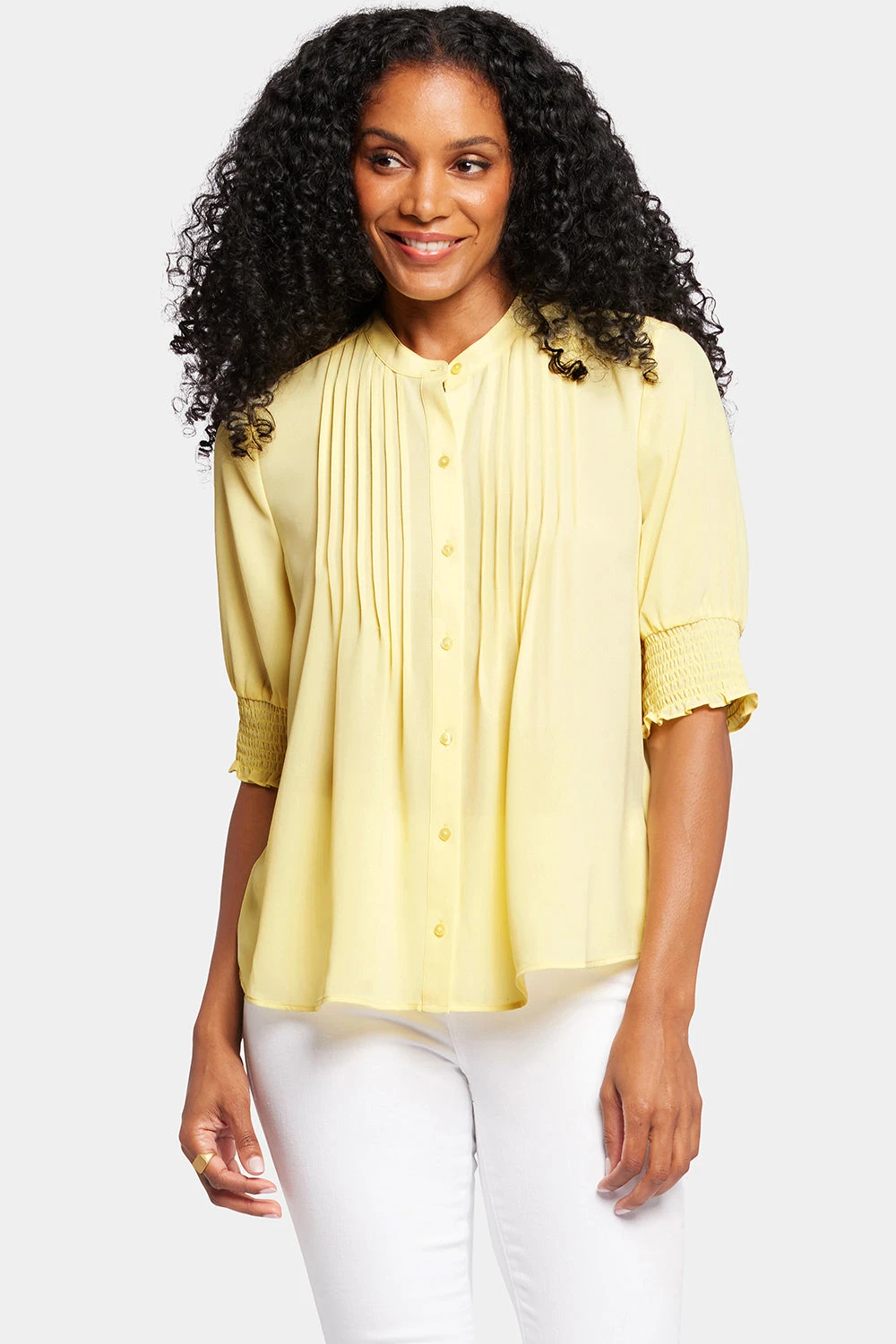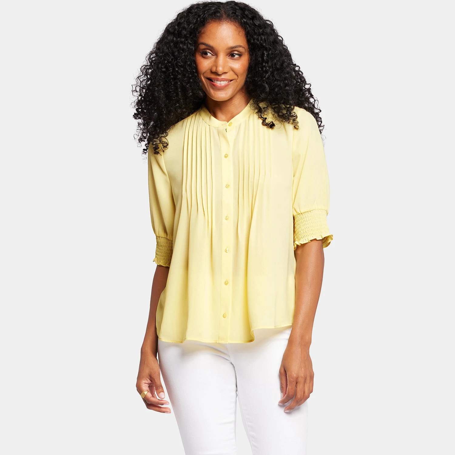 Charming details abound in the Pleated Short Sleeved Blouse by NYDJ. The short puff sleeves feature ruffled stretch smock cuffs, while narrow pleats accent the front and back of the bodice. Finished with a band collar and front button closure. This blouse is made with a sustainable polyester fiber created from 100% post-consumer plastic waste, resulting in less water and energy use and fewer greenhouse gas emissions without changing the look and feel of the fabric.