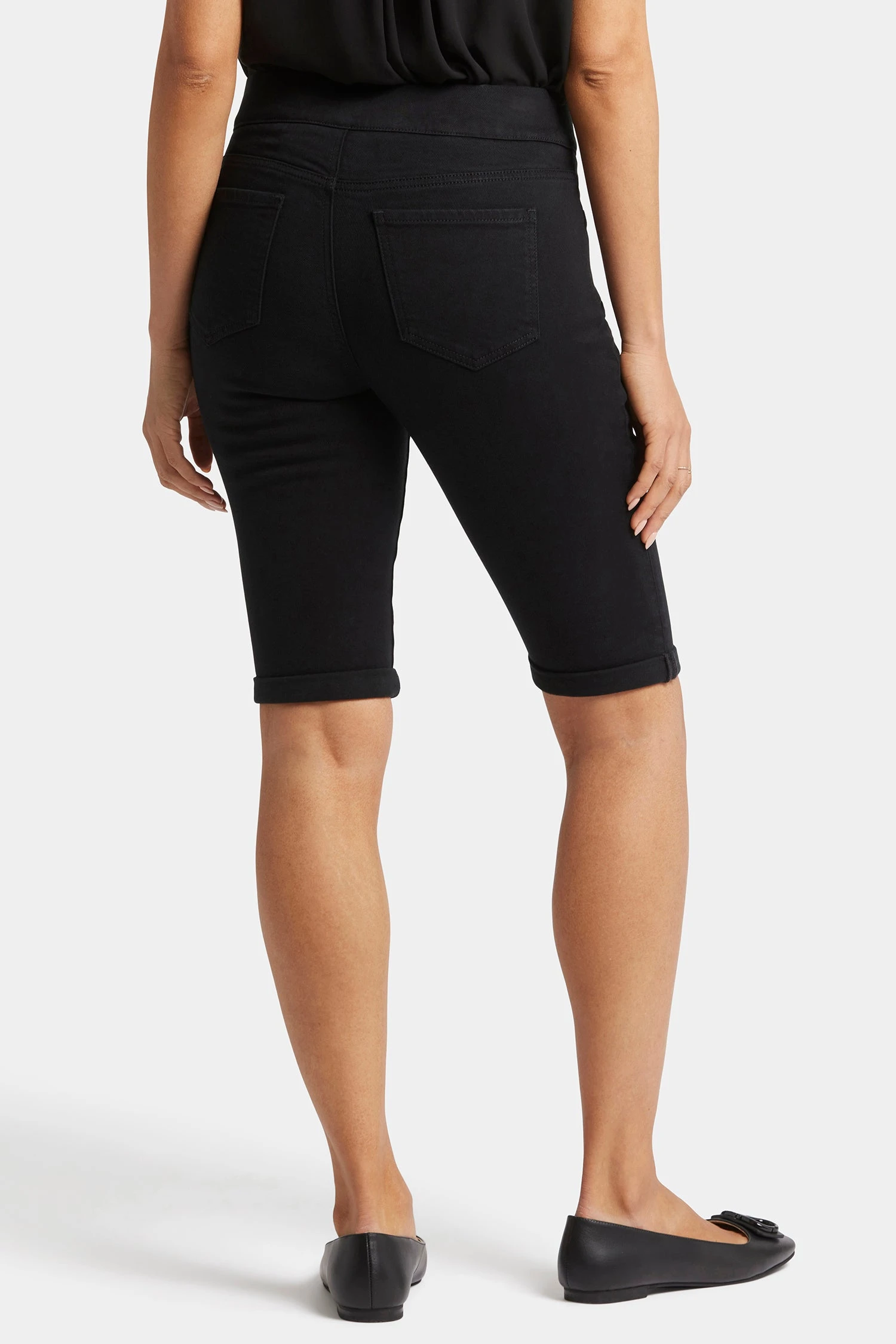Designed to sculpt curves comfortably, NYDJ’s Pull-On Bike Shorts are a must-have for casual styling on warm days. Made from Soft-Contour Denimâ„¢, our softest denim ever, these shorts feature a soft woven blend with a touch of stretch and a contouring fit that gently sculpts curves for a smooth, body-hugging look. An easy pull-on waistband holds you in, while Lift Tuck® Technology uses a proprietary slimming panel to further smooth and shape. Finished with faux front pockets, a faux fly, functional back pockets and double roll cuffs. This short is made with earth-friendly methods that result in reduced consumption of water, chemicals and/or energy and with Tencelâ„¢ Lyocell, a sustainable wood-based fiber.