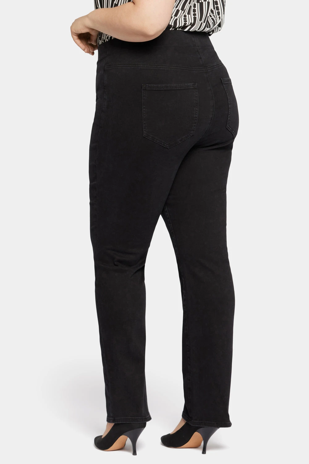 The Pull-On Straight Pants by NYDJ in Plus Size hugs and sculpts curves. These slimming pants feature a a classic straight leg cut. Our Lift Tuck® Technology uses a proprietary slimming panel with a patented criss-cross design to ensure an ultra-flattering silhouette. It features a pull-on waistband for ease of wear and dual back pockets.