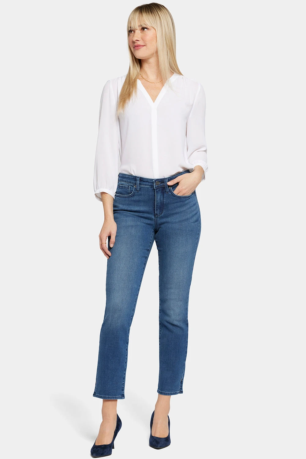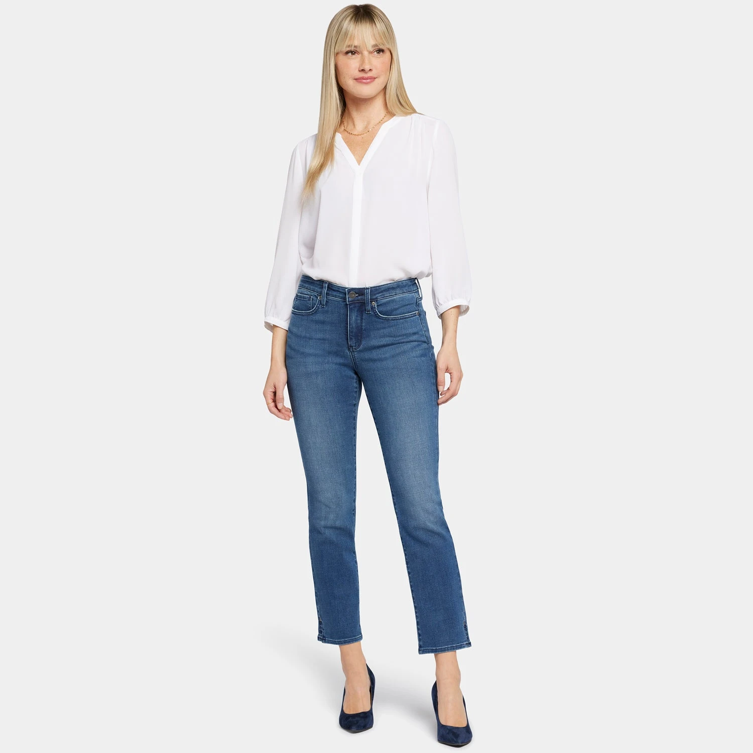 The Sheri Slim Ankle Jeans with Riveted Side Slits by NYDJ offer an expertly cut slim fit with a little edge. A rivet-topped slit at each hem makes them playful, unique and perfect to pair with chic sandals and flats. Lift Tuck® Technology uses a proprietary slimming panel with a patented criss-cross design to shape and support your curves for an always-sleek silhouette. Features classic five-pocket styling, zip fly and button closure. Bluewell is a medium dark wash with strong whiskers on the front hips, sanding throughout and light distressing on the pocket edges. This jean is made with earth-friendly methods that result in reduced consumption of water, chemicals and/or energy.