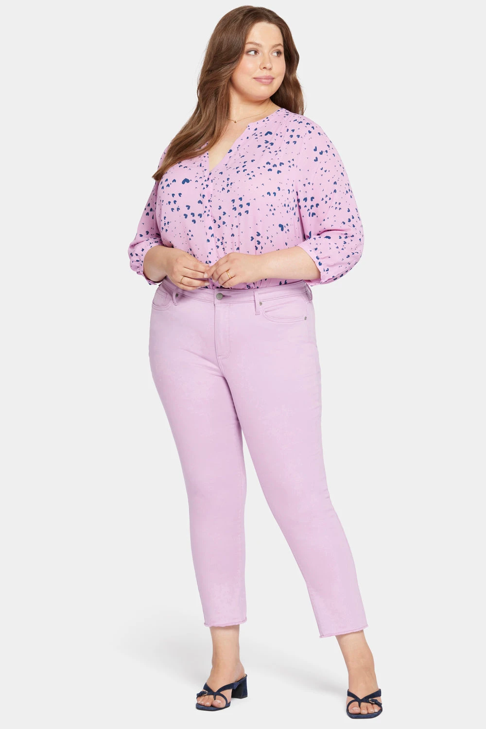 Prepare yourself for more than a few admiring stares. NYDJ’s Sheri Slim Ankle Jeans in Plus Size are an expertly cut fit that’s always in season. Lift Tuck® Technology uses a proprietary slimming panel with a patented criss-cross design to shape and support your curves for an always-sleek silhouette. Features frayed hems, classic five-pocket styling, zip fly and button closure. This jean is made with earth-friendly methods that result in reduced consumption of water, chemicals and/or energy.
