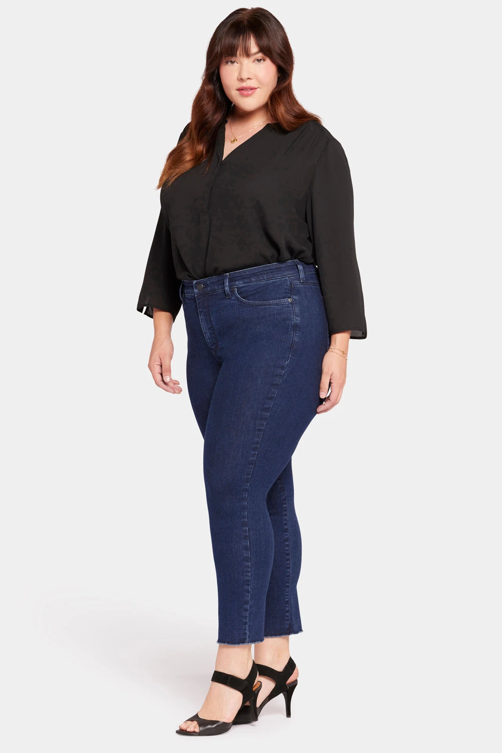 Prepare yourself for more than a few admiring stares. NYDJ’s Sheri Slim Ankle Jeans in Plus Size are an expertly cut fit that’s always in season. Lift Tuck® Technology uses a proprietary slimming panel with a patented criss-cross design to shape and support your curves for an always-sleek silhouette. Features frayed hems, classic five-pocket styling, zip fly and button closure. Mystique is a classic dark and deep saturated denim wash without whiskers or sanding. This jean is made with earth-friendly methods that result in reduced consumption of water, chemicals and/or energy.