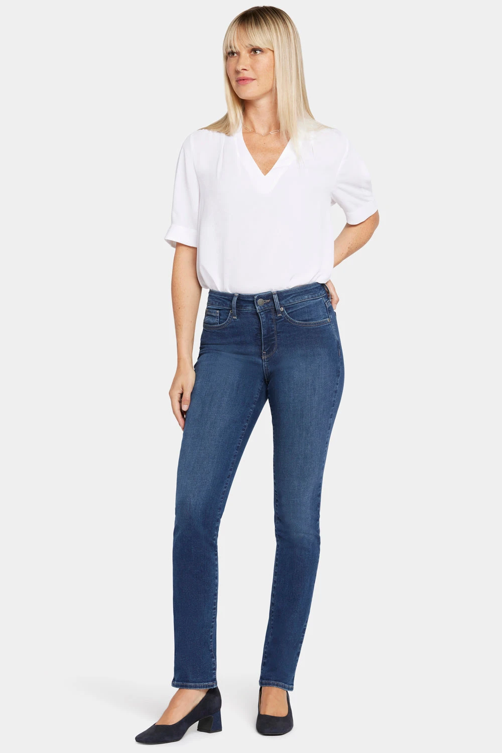 Prepare yourself for more than a few admiring stares. NYDJ’s Sheri Slim Jeans feature an expertly cut fit that’s always in season. Enhance your assets and streamline your silhouette with our signature Lift Tuck® Technology, which flattens and flatters using a proprietary slimming panel with a patented criss-cross design. Features classic five-pocket styling, zip fly and button closure. Crockett is a rich dark indigo wash featuring light whiskering on the front hips and soft fading on the front thighs, knees and seat that bring out its classic character. Landslide is a rich, smoothly contrasted medium dark wash with vibrant whiskers on the front hips and fading on the front thighs, knees and seat. Mystique is a classic dark and deep saturated denim wash without whiskers or sanding. Sweetbay is a medium wash that offers an authentic vintage vibe with feathered hand sanding on the front thighs and seat, strong whiskers on the front hips and soft highs and lows along the seams. This jean is made with earth-friendly methods that result in reduced consumption of water, chemicals and/or energy.