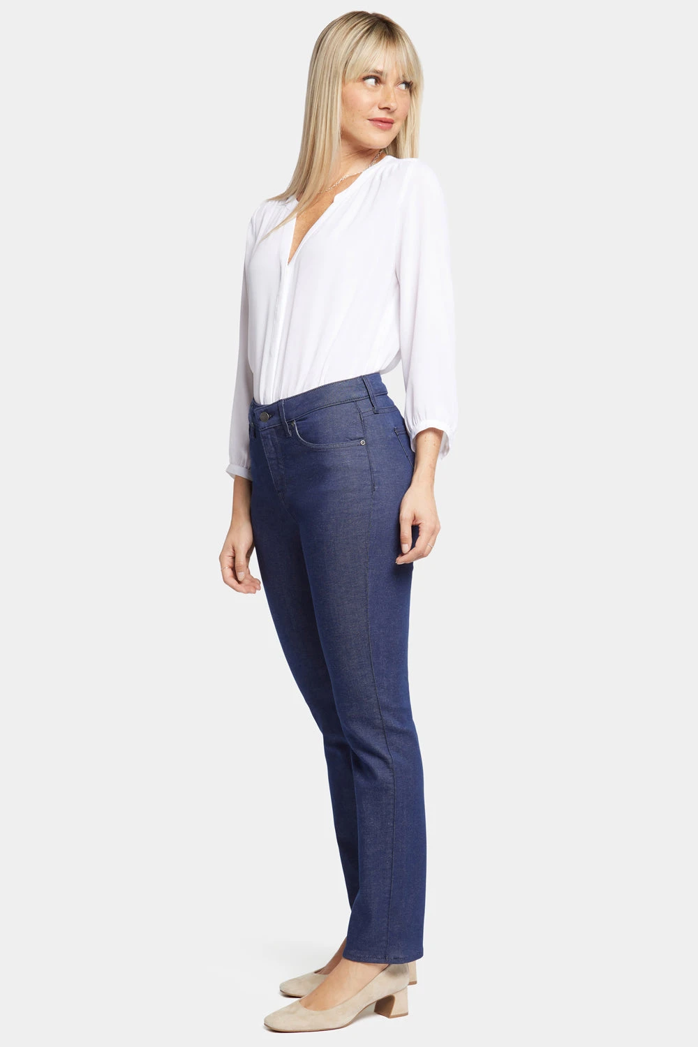 Prepare yourself for more than a few admiring stares. NYDJ’s Sheri Slim Jeans feature an expertly cut fit that’s always in season. Made using less water and energy than conventional indigo denim and incorporating recycled and renewable raw materials, every IndigoLast™ jean provides lasting color intensity. Enhance your assets and streamline your silhouette with our signature Lift Tuck® Technology, which flattens and flatters using a proprietary slimming panel with a patented criss-cross design. Features classic five-pocket styling, zip fly and button closure.