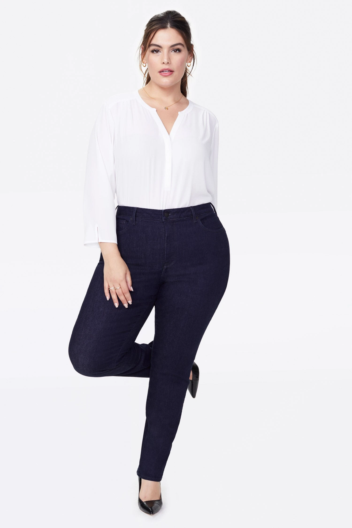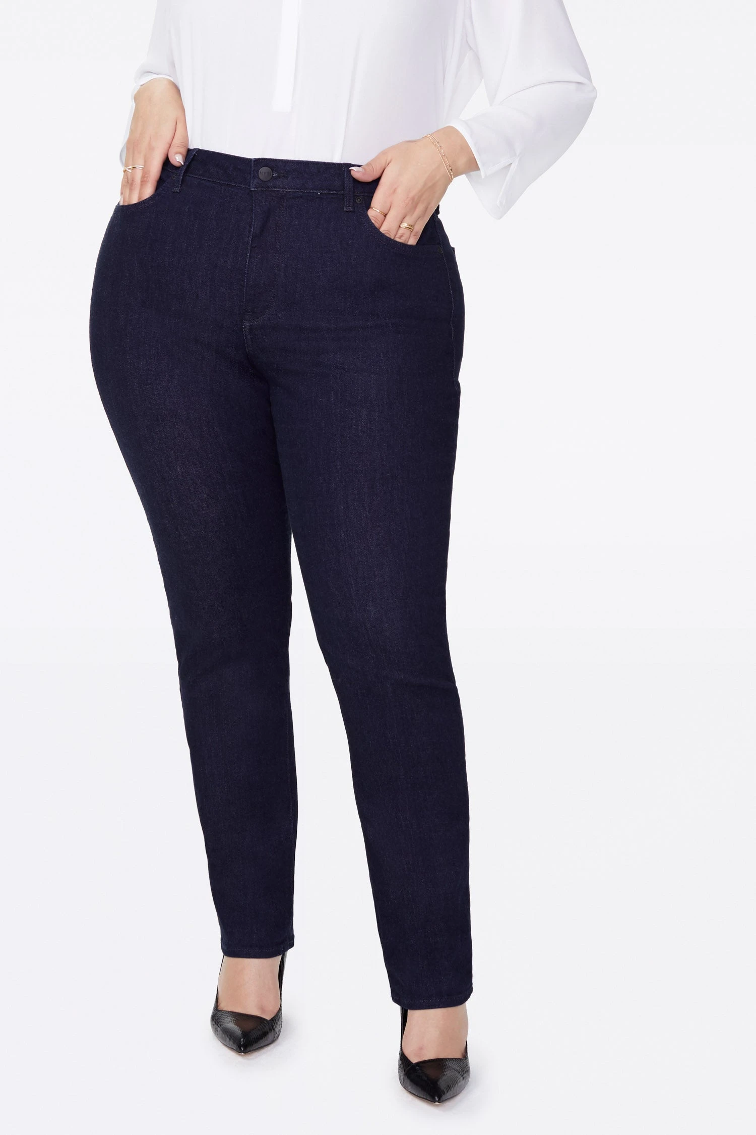 Prepare yourself for more than a few admiring stares. NYDJ’s Sheri Slim Jeans in Plus Size are an expertly cut fit that’s always in season. Lift Tuck® Technology uses a proprietary slimming panel with a patented criss-cross design to shape and support your curves for an always-sleek silhouette. Features classic five-pocket styling, zip fly and button closure.