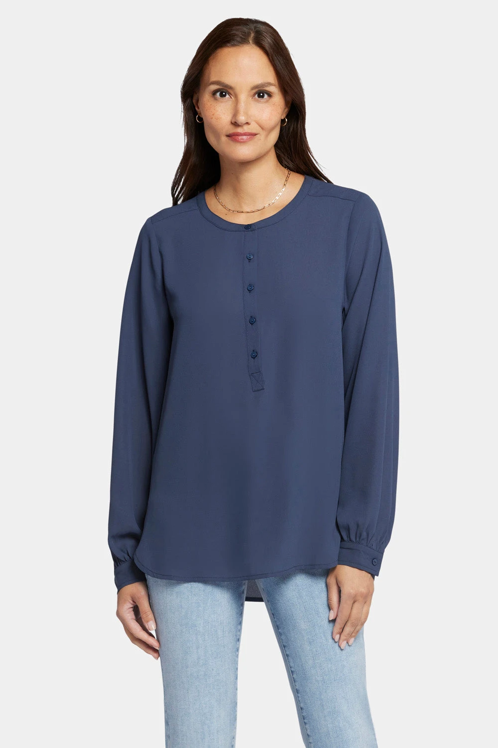 Classic meets chic in the Simone Blouse by NYDJ. This easy, relaxed-fit blouse pairs effortlessly with everything from slimming pants to casual jeans and skirts. It features billowing sleeves accented with soft gathers at the button cuffs, and it’s finished with front button closures as well as pleating at the back neck. This blouse’s fabric is made with a sustainable polyester fiber created from 100% post-consumer plastic waste, resulting in less water and energy use and fewer greenhouse gas emissions without changing the look and feel of the fabric. The buttons are made with 50% post-consumer recycled polyester.