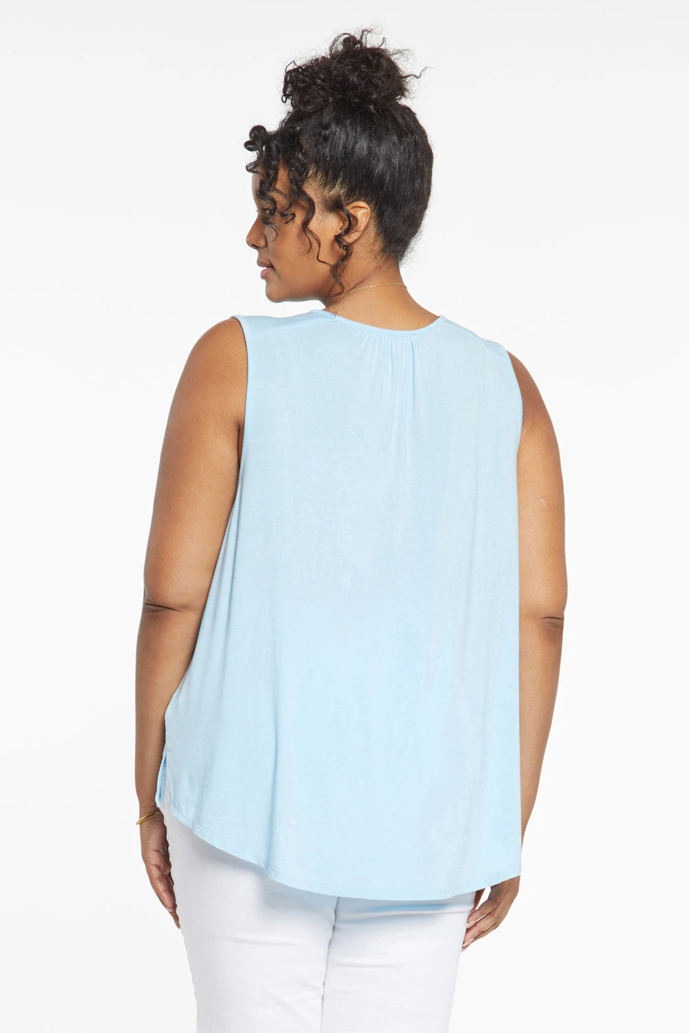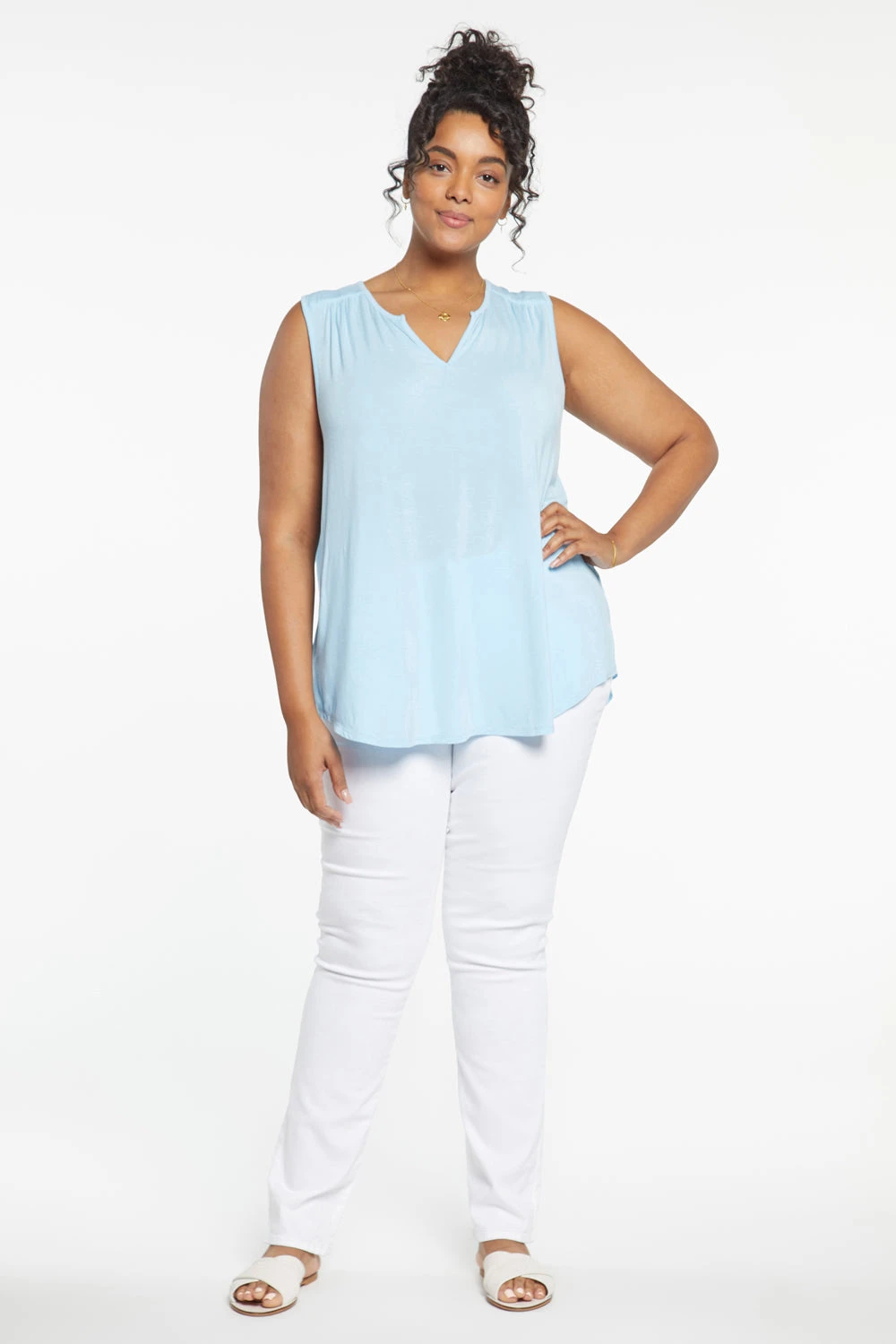 Like our classic Perfect Tee, the NYDJ Sleeveless Perfect Tee in Plus Size truly is a perfect everyday essential. Boho-inspired with a tunic neckline, this wear-with-anything top is softened with pintucks at the shoulder, a shaped hemline and a relaxed fit. It’s ideal for warmer weather as well as layering.