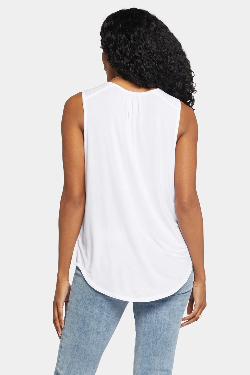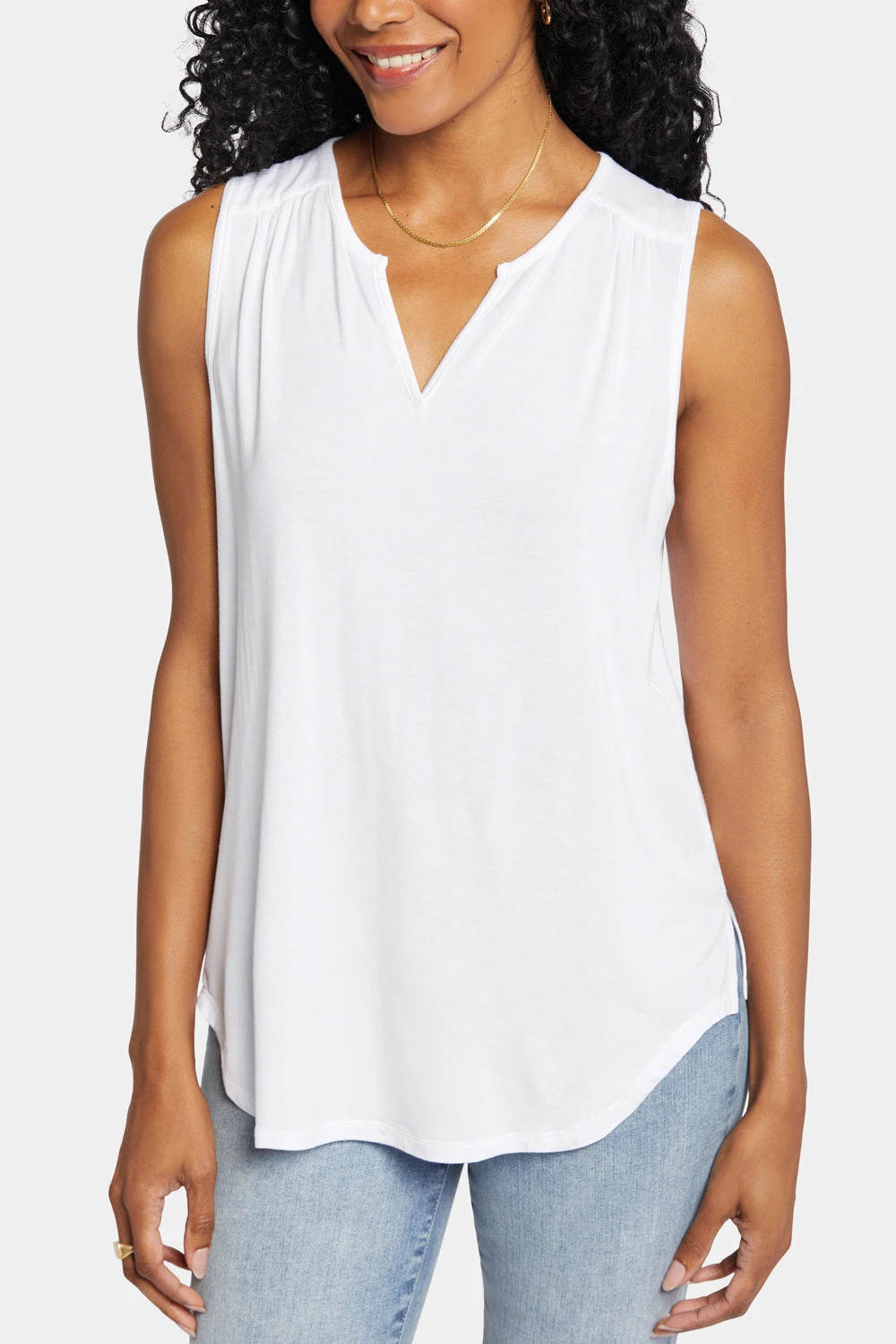 Like our classic Perfect Tee, the NYDJ Sleeveless Perfect Tee truly is a perfect everyday essential. Boho-inspired with a tunic neckline, this wear-with-anything top is softened with pintucks at the shoulder, a shaped hemline and a relaxed fit. It’s ideal for warmer weather as well as layering.