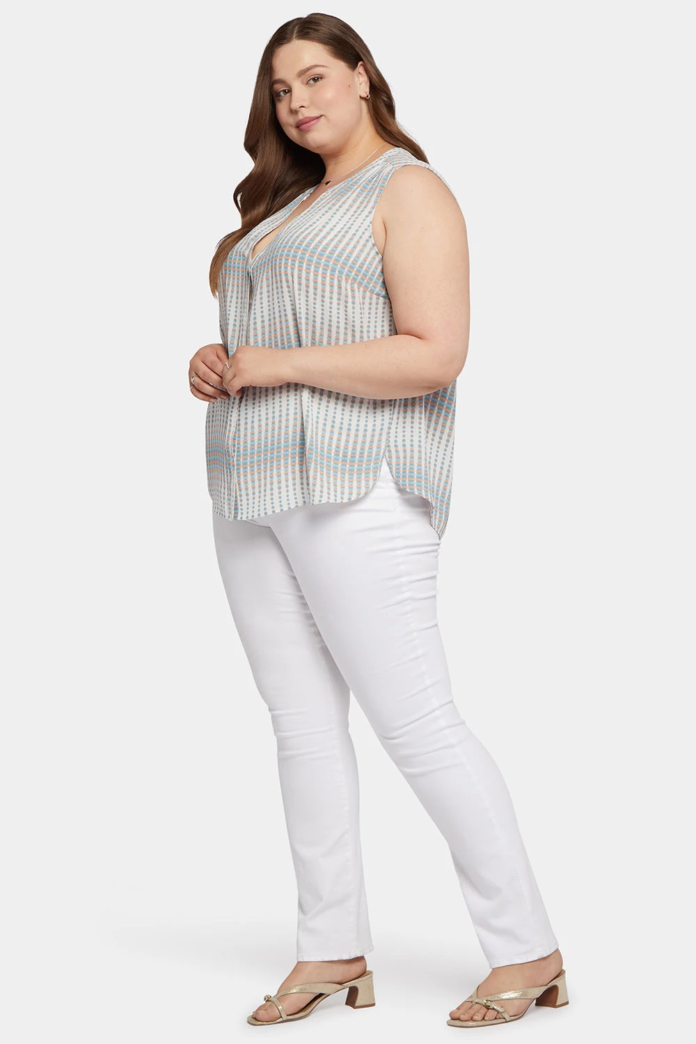 No wardrobe is complete without a flattering sleeveless blouse. NYDJ’s Sleeveless Pintuck Blouse in Plus Size checks all the boxes—it’s relaxed, it’s refined and it goes with everything. A mandarin collar and inverted pleat in the back give this style a polished look for any occasion. This blouse’s fabric is made with a sustainable polyester fiber created from 100% post-consumer plastic waste, resulting in less water and energy use and fewer greenhouse gas emissions without changing the look and feel of the fabric. The buttons are made with 50% post-consumer recycled polyester.