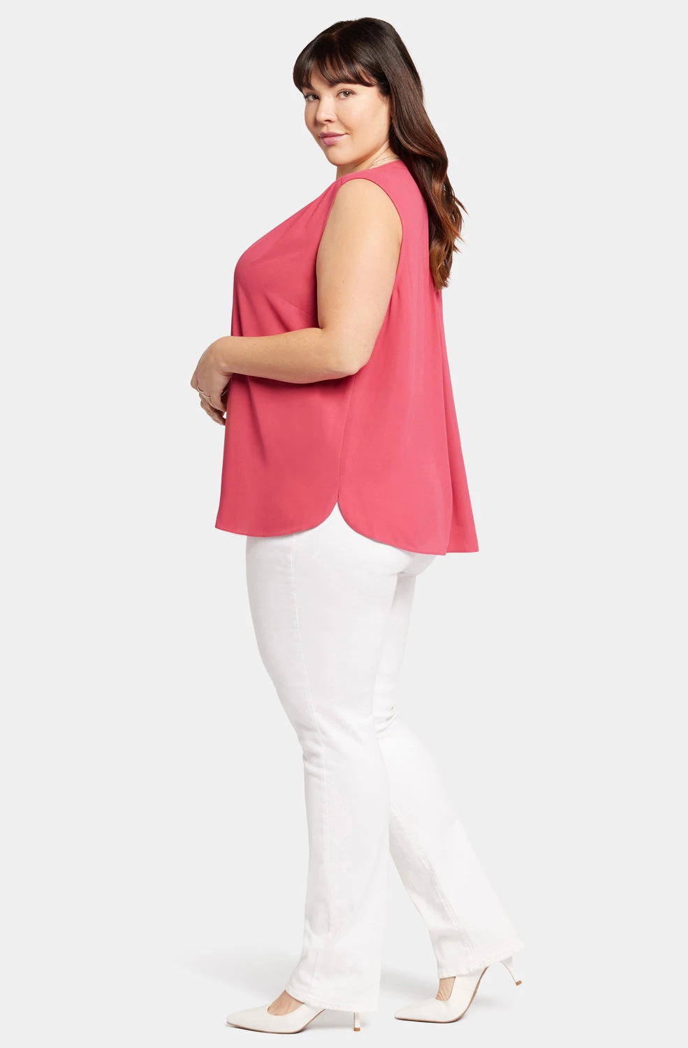 No wardrobe is complete without a flattering sleeveless blouse. NYDJ’s Sleeveless Pintuck Blouse in Plus Size checks all the boxes—it’s relaxed, it’s refined and it goes with everything. A mandarin collar and inverted pleat in the back give this style a polished look for any occasion. This blouse’s fabric is made with a sustainable polyester fiber created from 100% post-consumer plastic waste, resulting in less water and energy use and fewer greenhouse gas emissions without changing the look and feel of the fabric. The buttons are made with 50% post-consumer recycled polyester.