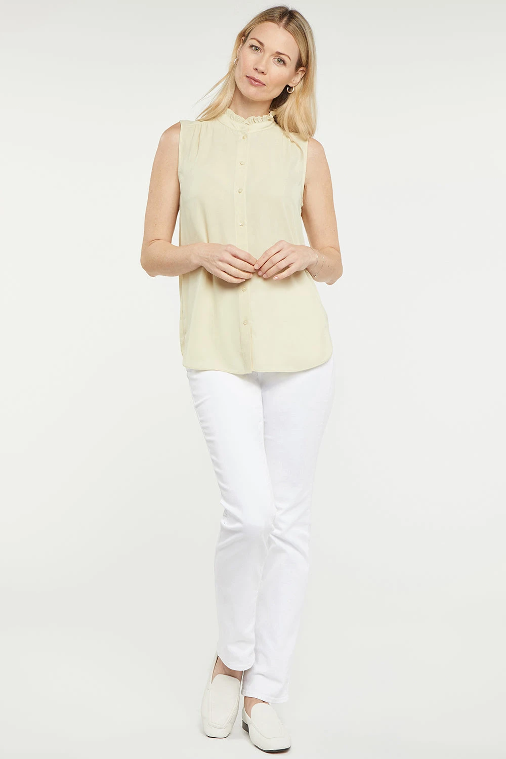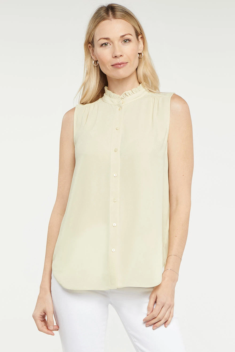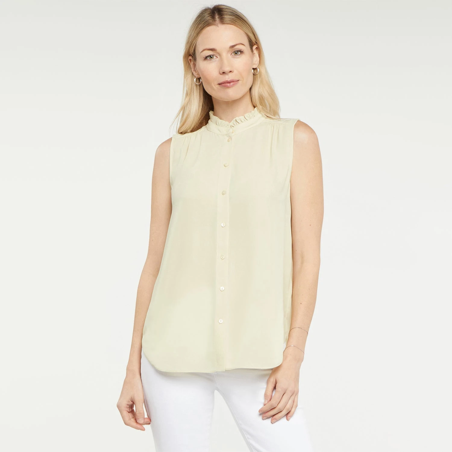 Your essential sleeveless blouse with a romantic twist. The Sleeveless Ruffle Neck Blouse by NYDJ makes any outfit more feminine with a ruffle-trimmed high collar and pintucked shoulders. This pretty style buttons up the front, and the sleeveless design makes it perfect for warm weather or layering under jackets and cardigans. This blouse is made with a sustainable polyester fiber created from 100% post-consumer plastic waste, resulting in less water and energy use and fewer greenhouse gas emissions without changing the look and feel of the fabric.