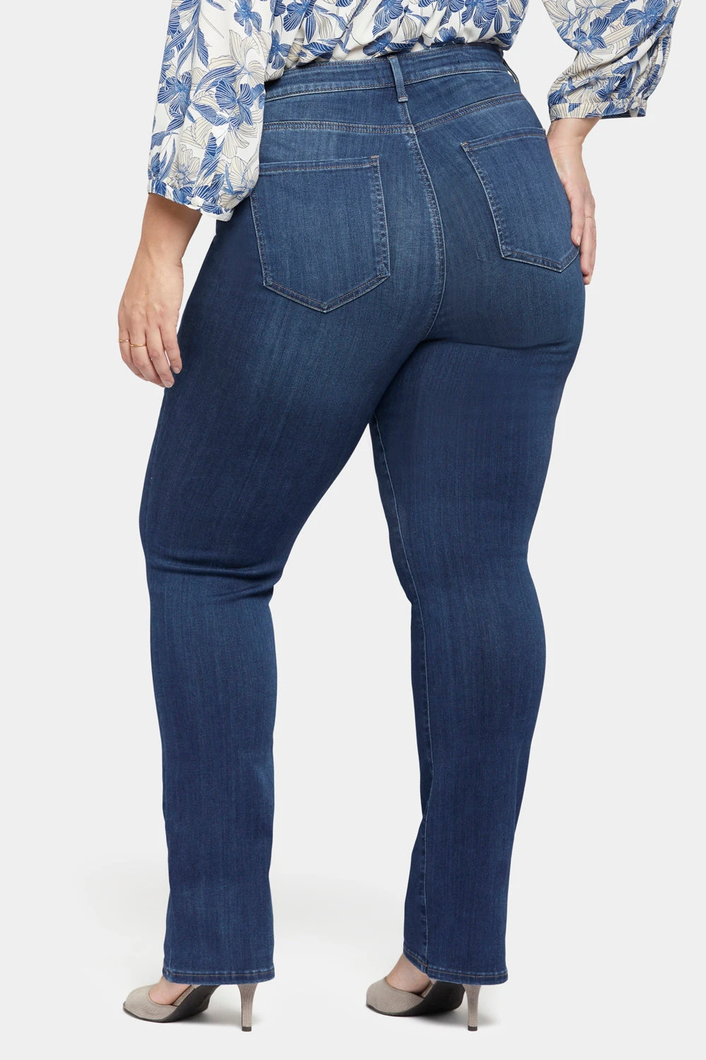 There’s nothing better than a bootcut jean—and NYDJ’s Slim Bootcut Jeans in Plus Size are the new fit you’ve been wanting. Our new sleek, slimming jeans feature a narrower fit from the hip through the knee, with an exaggerated bootcut flare at the hem. These jeans are also made with Sure Stretch® denim technology to give you full range of movement and serious comfort. Our Lift Tuck® Technology uses a proprietary slimming panel with a patented criss-cross design to shape and support your curves for an always-sleek silhouette. Blue Moon is a lively, rich medium-dark indigo wash with soft whiskering on the front hips and subtle fading on the front thighs, knees and seat that bring out its classic character. Lovesick is a lighter wash with tucks at the waist and pocket scoops, whiskering on the front hips and fading on the front thighs, knees and seat to enhance its vintage character. Finished with a zip and button fly and classic five-pocket styling.