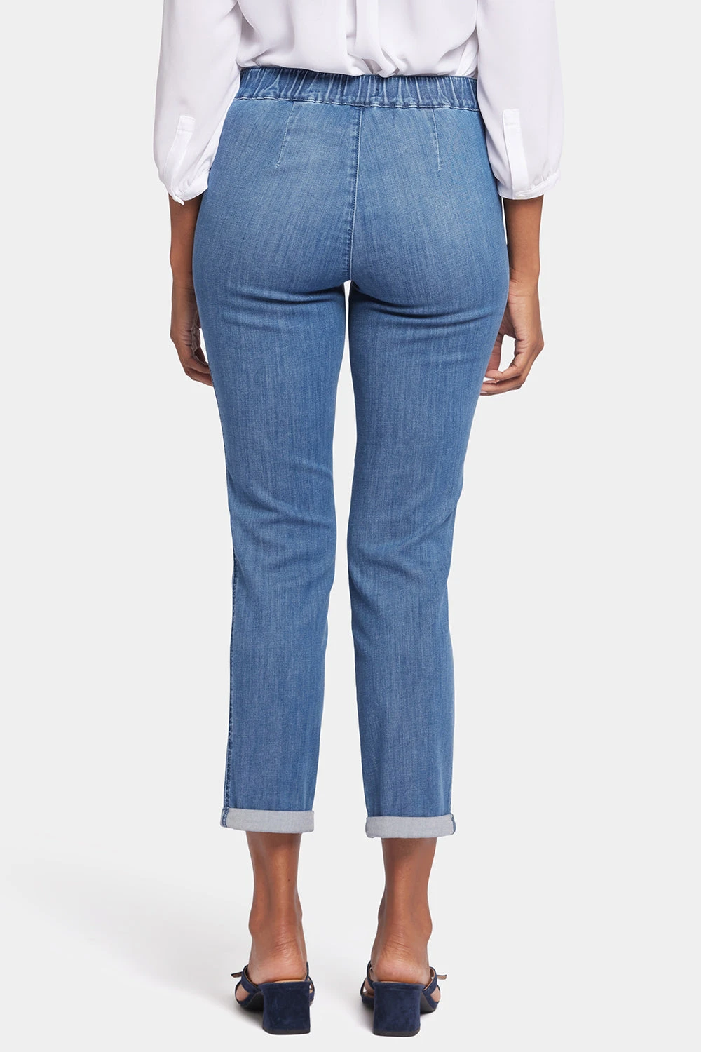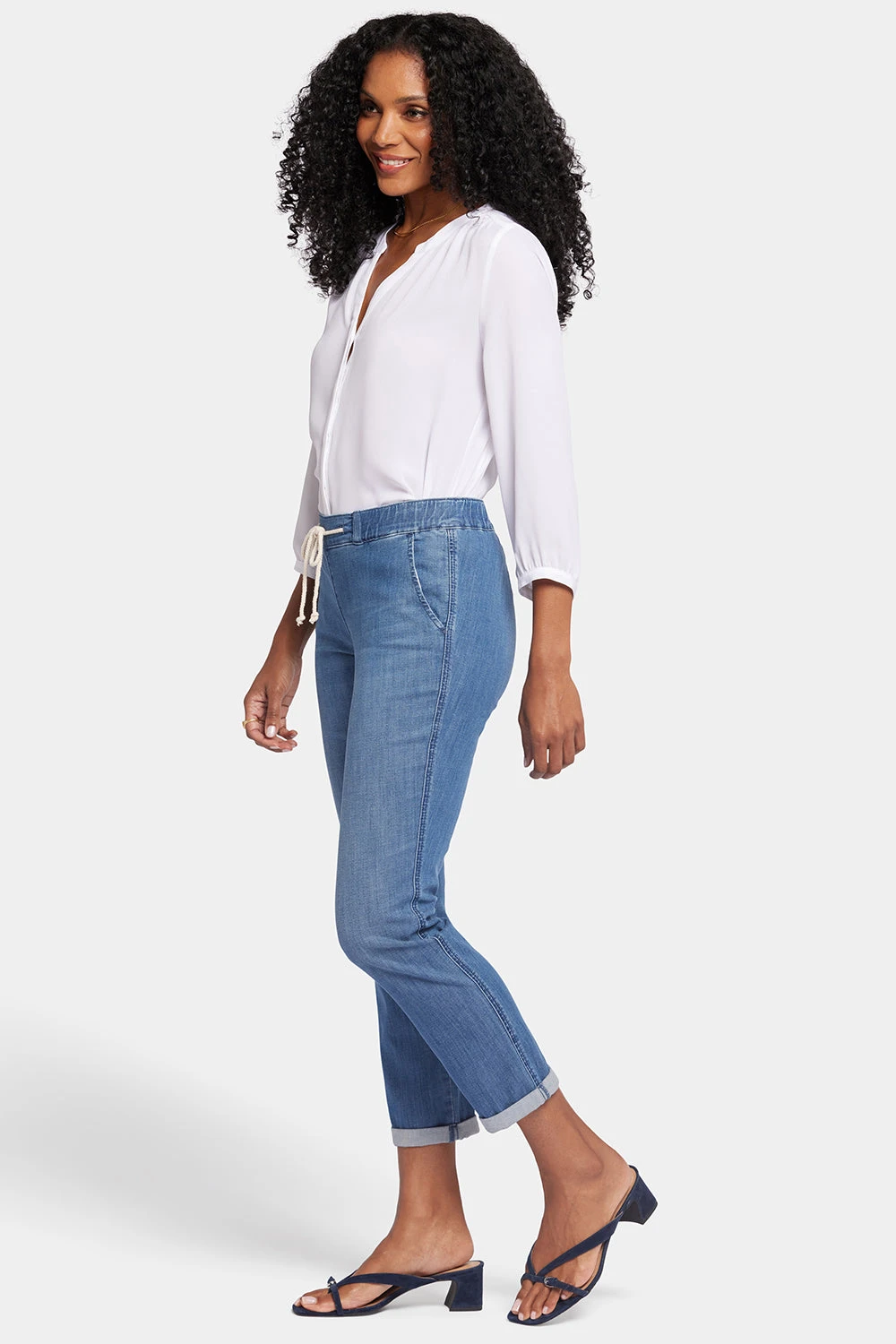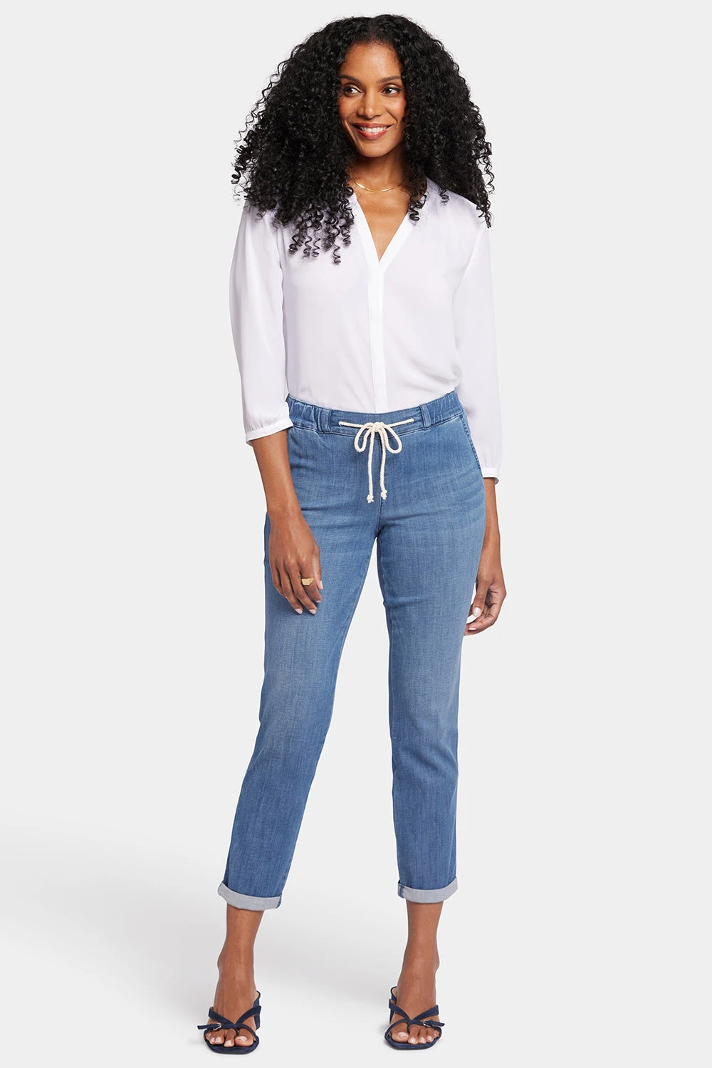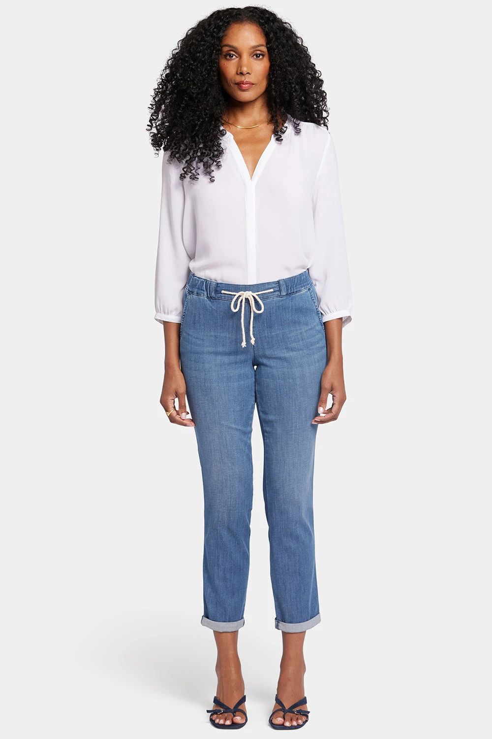 The Slim Jogger Ankle Jeans by NYDJ combine our signature flattering design elements with on-trend athletic styling. Cut in a slimmer jogger shape that sits close to the body, this comfortable denim silhouette has a drawstring stretch tie waist and playful cuffed hems. As with all our jeans, the Lift Tuck® Technology in this pair uses a proprietary slimming panel with a patented criss-cross design to smooth and support your curves. Finished with front slash pockets, back welt pockets and a pull-on waistband for ease of wear.