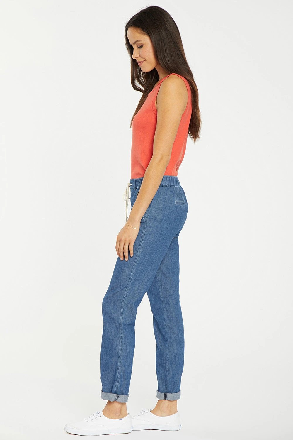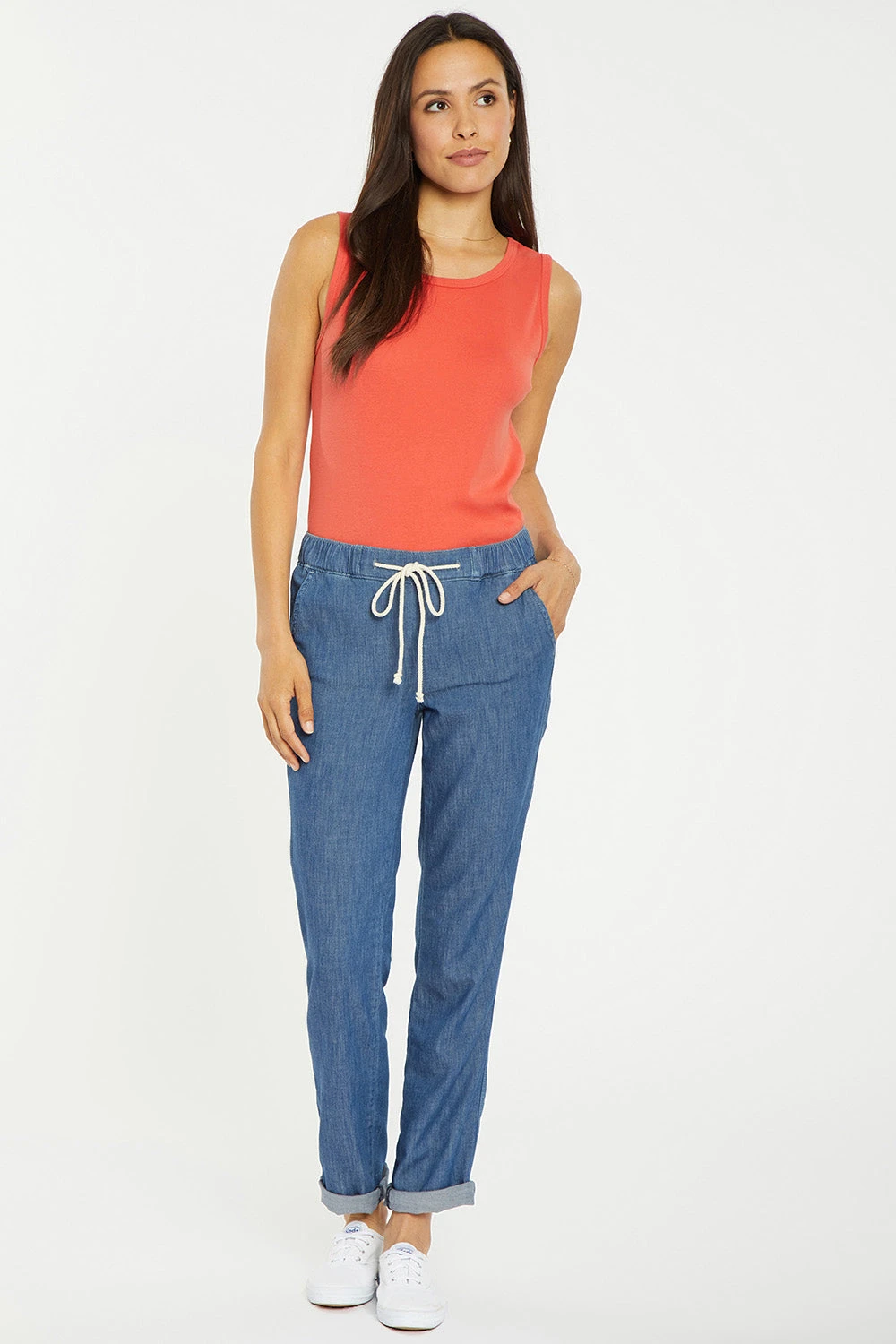 The Slim Jogger Ankle Pants in Petite by NYDJ combine our signature flattering design elements with on-trend athletic detail. Cut in a slender jogger shape that sits close to the body, this comfortably soft and lightweight, 100% cotton chambray style has a drawstring stretch tie waist and playful cuffed hems. As with our jeans, the Lift Tuck® Technology in these pants uses a proprietary slimming panel with a patented criss-cross design to smooth and support your curves. Finished with front slash pockets, back welt pockets and a pull-on waistband for ease of wear.
