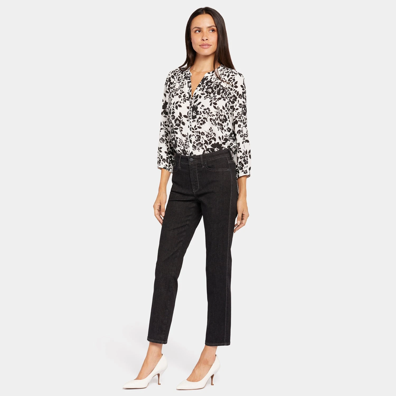 The Stella Tapered Ankle Jeans in Petite by NYDJ are a cool new style that’s both flattering and on trend. This slimming pair sits right at the natural waist and has an ankle-length tapered fit. Our Lift Tuck® Technology uses a proprietary slimming panel with a patented criss-cross design to shape and support your curves for an always-sleek silhouette. Finished with a zip and button fly and classic five-pocket styling. Eternity is a vintage-inspired black wash brought out by stone washing. This jean is made with earth-friendly methods that result in reduced consumption of water, chemicals and/or energy.