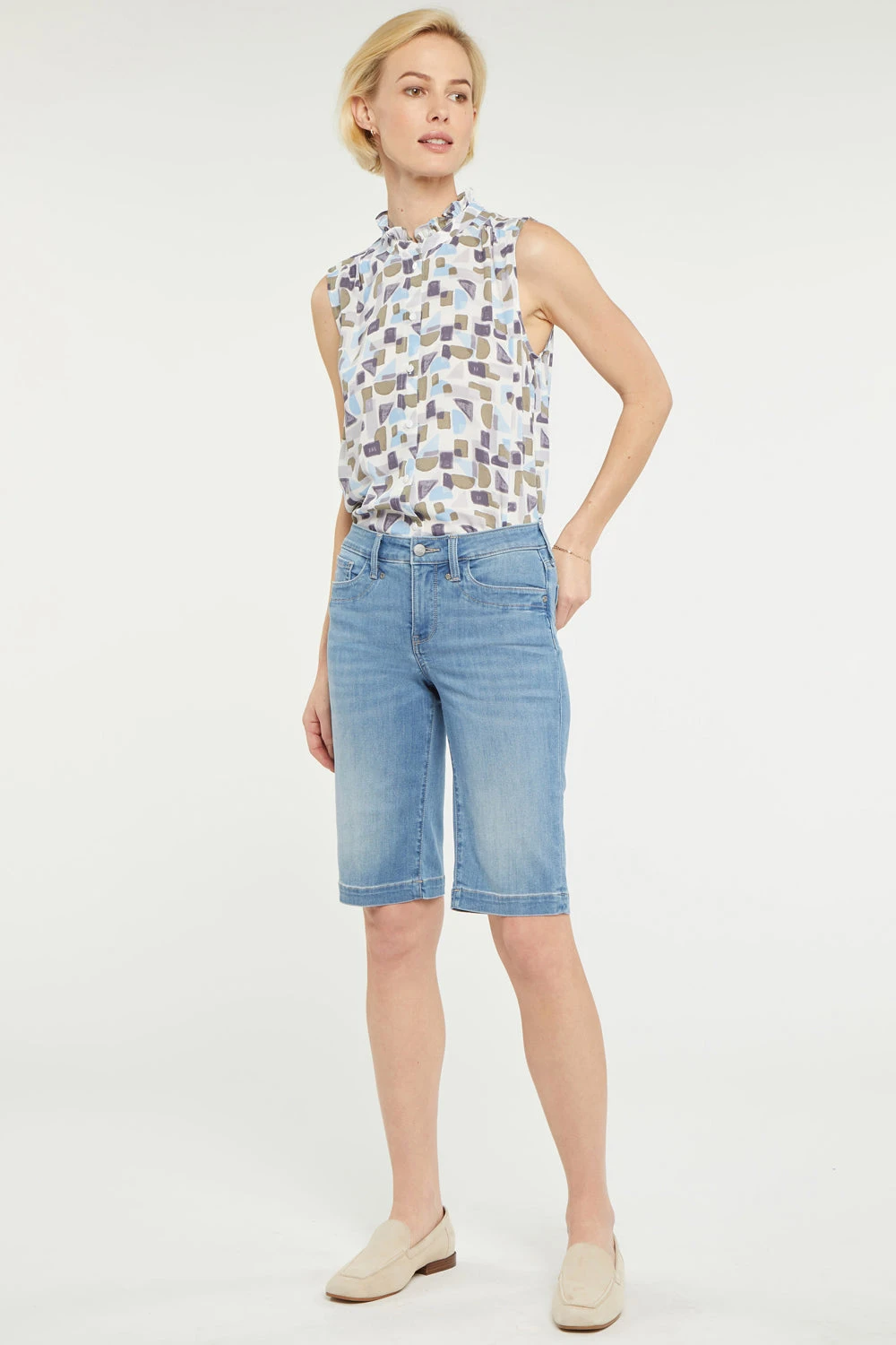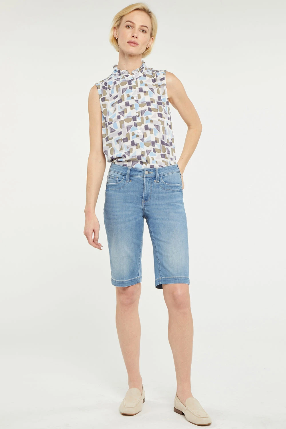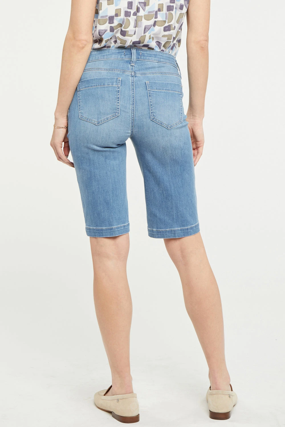 Elevate your warm-weather look with the Tailored Bermuda Denim Shorts in Petite by NYDJ. These lightweight denim shorts feature a slim leg opening, trouser folds and a deep hem with topstitching to give them polished sophistication. Our signature Lift Tuck® Technology slims in front and contours in back for a flattering fit. Finished with five-pocket styling and a zip fly with button closure. Our Quinta wash features light distressing on the front and back pocket edges as well as a pebbled treatment that results in a slightly unique look for each short. Soft lightweight denim provides a comfortable, breezy feel. This short is made with earth-friendly methods that result in reduced consumption of water, chemicals and/or energy.
