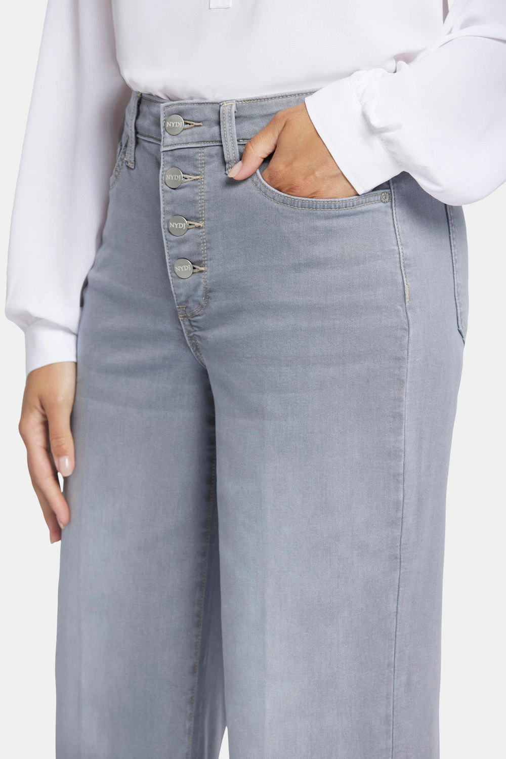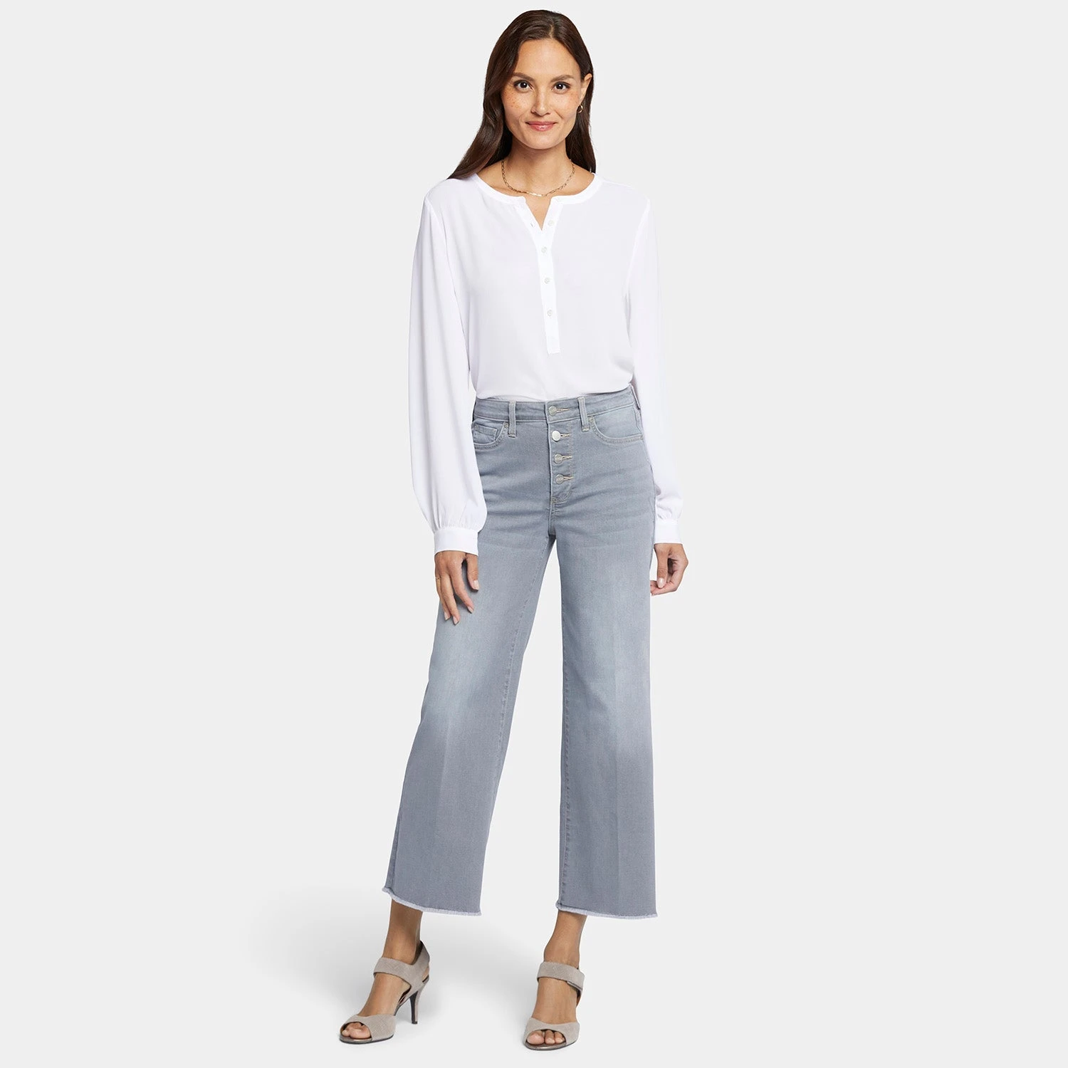 The Teresa Wide Leg Ankle Jeans with High Rise and Frayed Hems by NYDJ have a lighthearted, on-trend silhouette that’s fun to pair with heels and ankle boots. Our Lift Tuck® Technology is made to help you keep your shape with a proprietary slimming panel with a patented criss-cross design that smooths and sculpts. Features five-pocket styling and an exposed button fly. This jean is made with earth-friendly methods that result in reduced consumption of water, chemicals and/or energy.