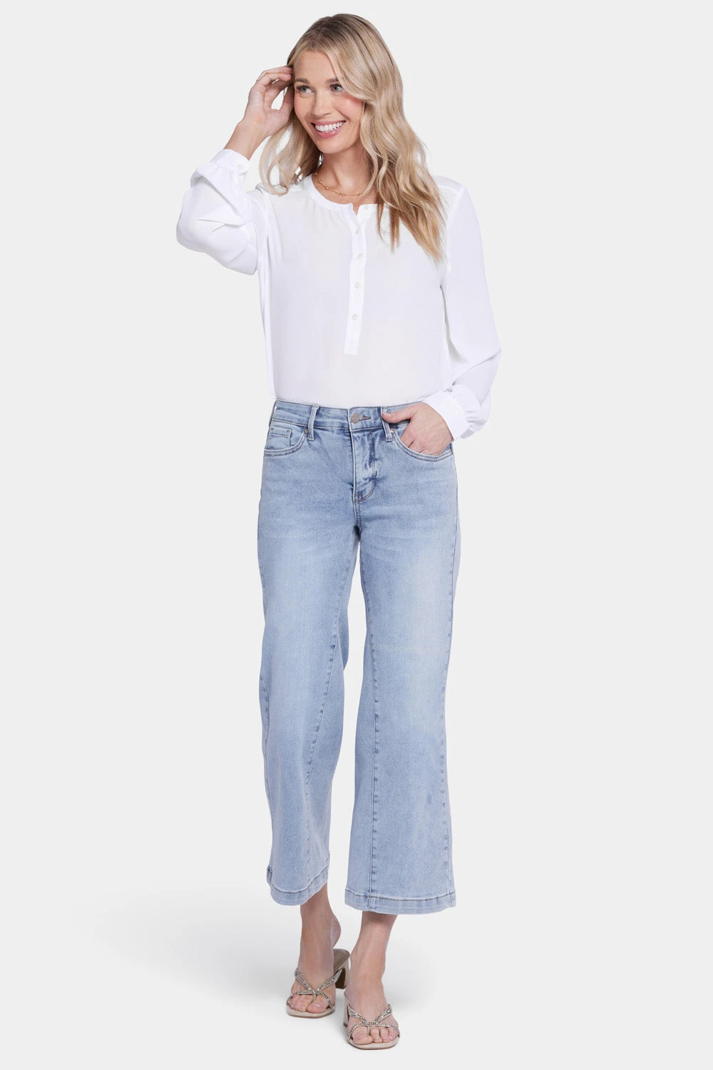 The Teresa Wide Leg Ankle Jeans with Contoured Inseams by NYDJ have a lighthearted, on-trend silhouette that’s fun to pair with heels and ankle boots. A wide leg opening adds drama, while a deep trouser hem gives this style a polished finish. Our Lift Tuck® Technology is made to help you keep your shape with a proprietary slimming panel with a patented criss-cross design that smooths and sculpts. Features contoured inseams that enhance the wide-leg look, five-pocket styling and a zip fly with button closure.
