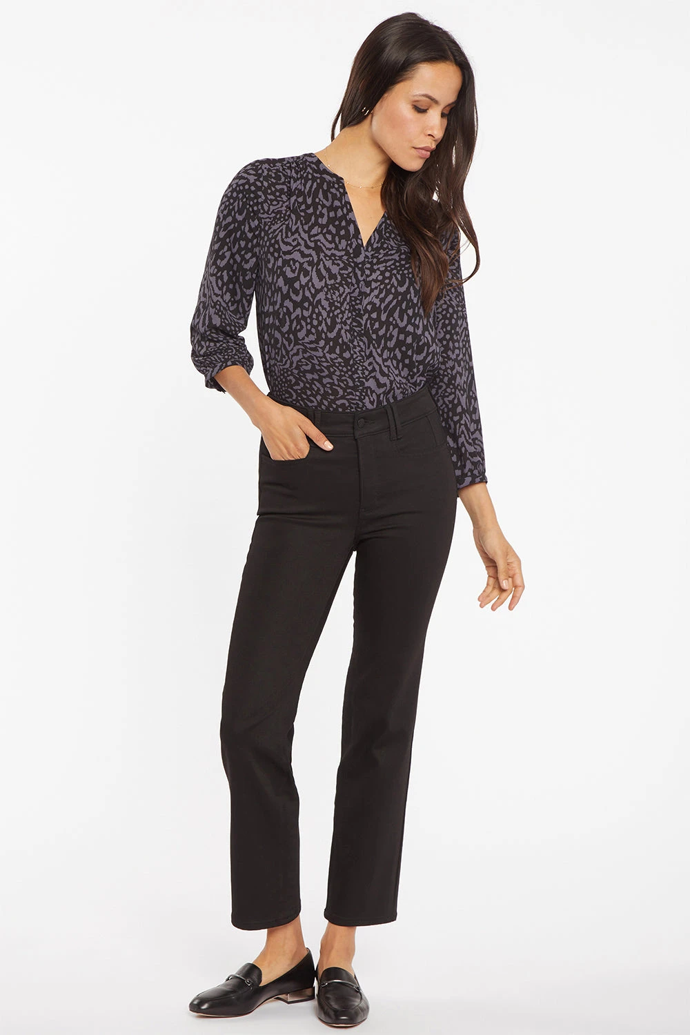 The ThighShaper™ Straight Ankle Jeans in BlackLast™ Denim with High Rise by NYDJ are a new design intended to slim and shape thighs with a high-stretch knit compression panel that some women report helps to aid in the reduction of inner-thigh rubbing. With their ankle length and flattering high-waisted silhouette, these jeans combine classic chic with fabulous fit. Made of up to 17 recycled plastic bottles per pair, every BlackLast™ style provides lasting color intensity with 50% lower environmental impact than traditional denim. These jeans also incorporate Lift Tuck® Technology, which uses a proprietary slimming panel with a patented criss-cross design that may help to smooth and support curves. Finished with a zip fly and button closure, square front pockets with seam detail and back patch pockets.