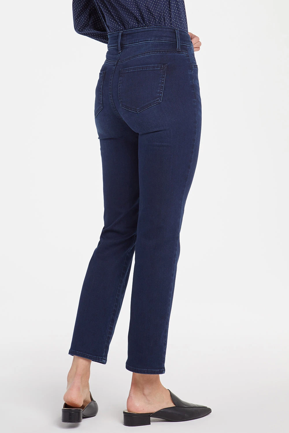 The ThighShaper™ Straight Ankle Jeans in Petite in Future Fit Denim® with High Rise by NYDJ are a new design intended to slim and shape thighs with a high-stretch knit compression panel which some women report helps to aid in the reduction of inner-thigh rubbing. With their ankle length and flattering high-waisted silhouette, these jeans combine classic chic with fabulous fit. To enhance their shaping benefits, Future Fit Denim® provides additional all-over compression that may help even contours, and Lift Tuck® Technology uses a proprietary slimming panel with a patented criss-cross design that may help to smooth and support curves. Finished with a zip fly and button closure, square front pockets with seam detail and back patch pockets. Waterbury is a rich, deep blue wash with subtle whiskers on the front hips and soft fading on the pocket scoops, front thighs and knees.