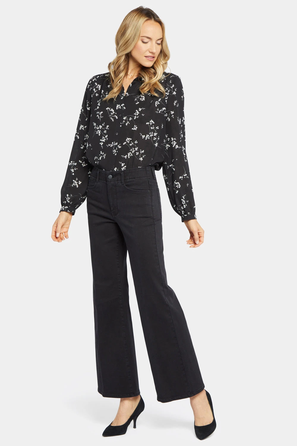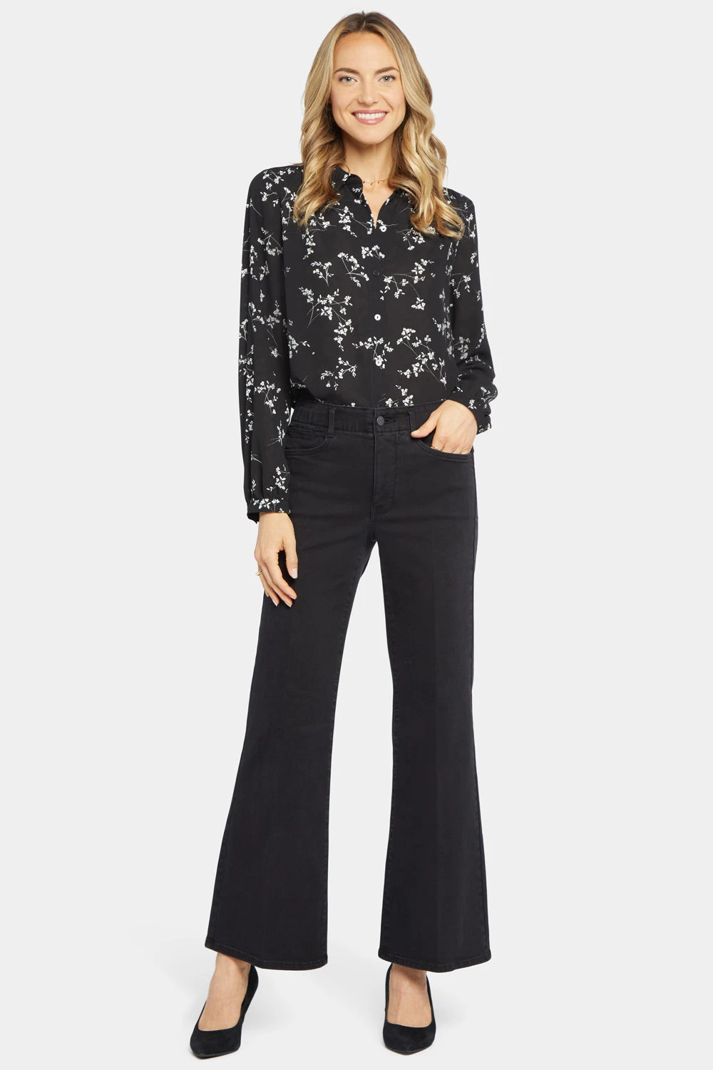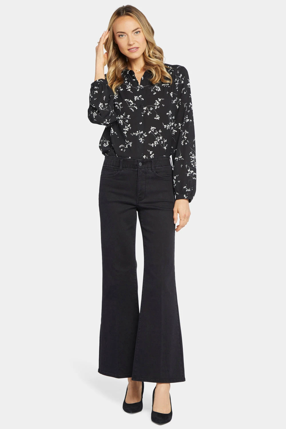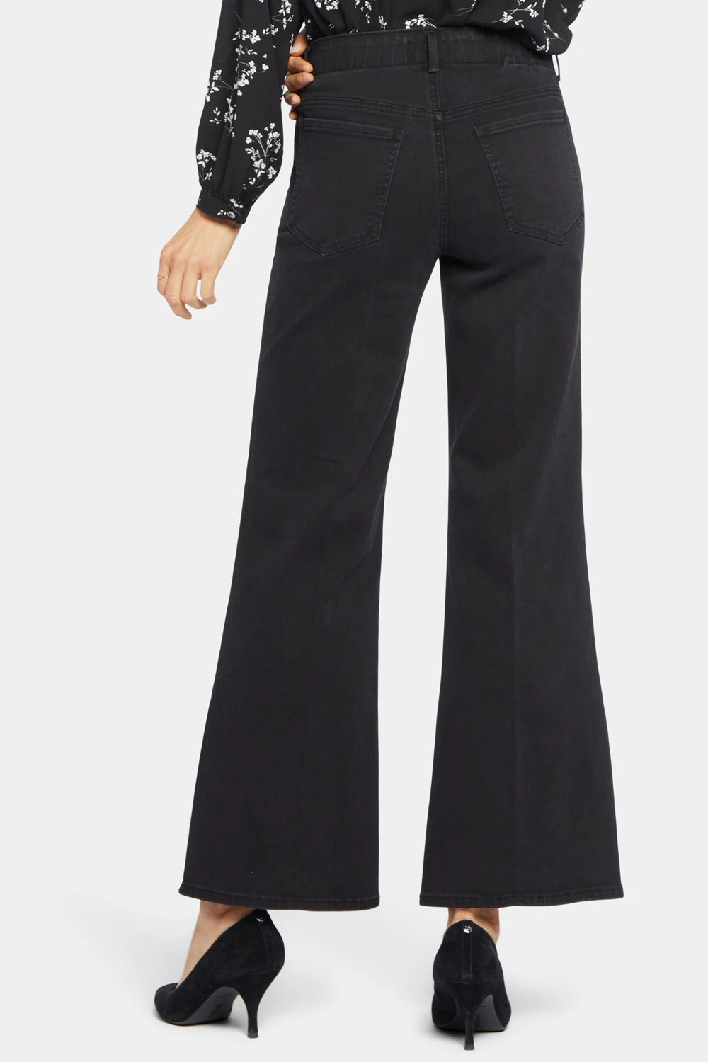 NYDJ’s Waist-Match™ Major Wide Leg Jeans with High Rise have a magical satin elastic that lines the interior of the waistband and molds to your waist for an extra-comfortable fit. This style features a slimming high rise and slim fit through the thigh before falling to an exaggerated flare. Our unique Lift Tuck® Technology uses a proprietary slimming panel with a patented criss-cross design for a smoother fit. Finished with a zip and button fly and five-pocket styling with a welt coin pocket. Vintage Black is a classic black wash with very subtle wear on the waistband, pocket scoops and seat that brings out its worn-in character.