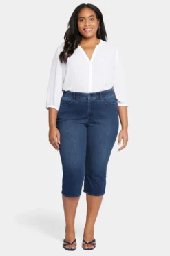 Designed to conform to you, NYDJ’s Waist-Match™ Slim Straight Crop Jeans in Plus Size have a magical satin elastic that lines the interior of the waistband and molds to your waist for an extra-comfortable fit. The cropped silhouette is perfect for all your warm-weather adventures. The design also includes our Lift Tuck® Technology, which uses a proprietary slimming panel to flatten in front and flatter curves in back. Finished with classic five-pocket styling, slits at the hem, zip fly and button closure. Prospect is a rich dark wash with softly feathered whiskers and hand sanding.